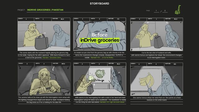 #: SHOT #: SHOT SIZE: SHOT SIZE: SCENE #: SCENE #: 1 1 MLS 1 2 CU The scene starts with the husband happily placing the grocery bag on the table, hoping for his wife's approval. Wife leans forward to have a look at the groceries. Narrator: Groceries done.. An inside out pov shot from the grocery bag as wife checks in for the items.Her expressions changes sharply, disappointed. SUPER is visible. Narrator VO: …or so he thinks. SHOT #: SHOT SIZE: SCENE #: 2 1 MLS Cut to the two shot of husband and wife, wife seems furious and tightens her shawl. the environment changes to an interrogation room. SHOT #: SHOT SIZE: SCENE #: 2 2 MCU The camera halts at his close up with the interrogation room setup with the lighting changed from bright and vibrant to stark. Husband holding the bag looks as if he is holding for his dear life. SHOT #: SHOT SIZE: SCENE #: 2 3 MLS Wife seems to be interrogating him with a stick in her hand and stark interrogation setup.He takes out a cauliflower. The cauliflower is visibly not the thing his wife had asked. Narrator VO: Ugh not even close! SHOT #: SHOT SIZE: SCENE #: 2 4 MS She seems furious-whips her stick-Fast cut. She points at a fresh banana on the white board.