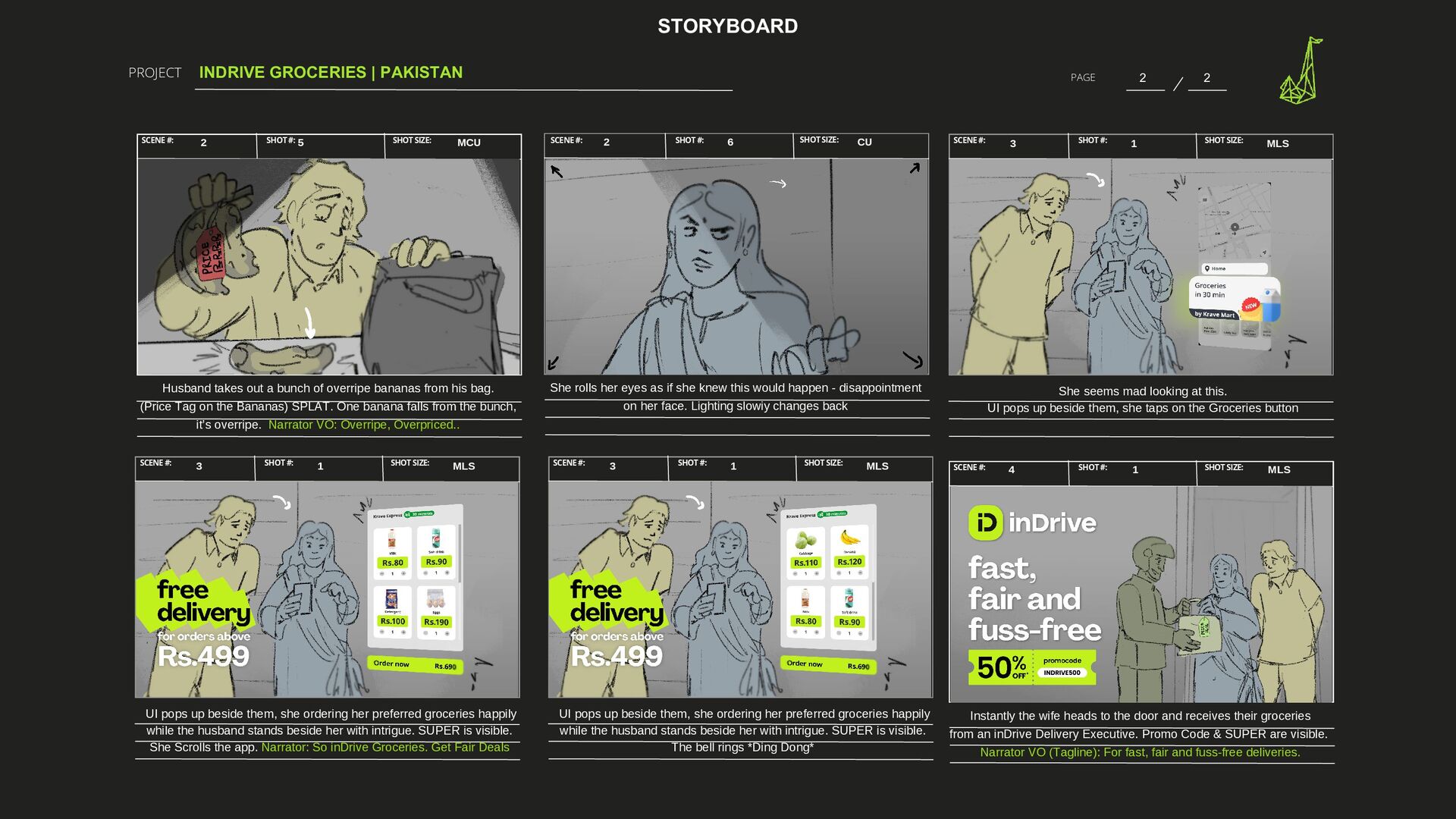 6 CU She rolls her eyes as if she knew this would happen - disappointment on her face. Lighting slowiy changes back SHOT #: SHOT #: SHOT SIZE: SCENE #: SCENE #: 2 5 MCU Husband takes out a bunch of overripe bananas from his bag. (Price Tag on the Bananas) SPLAT. One banana falls from the bunch, it’s overripe. Narrator VO: Overripe, Overpriced.. SHOT #: SHOT SIZE: SCENE #: 3 1 MLS She seems mad looking at this. UI pops up beside them, she taps on the Groceries button SHOT #: SHOT #: SHOT SIZE: SHOT SIZE: SCENE #: SCENE #: 3 1 MLS 3 1 MLS UI pops up beside them, she ordering her preferred groceries happily while the husband stands beside her with intrigue. SUPER is visible. The bell rings *Ding Dong* UI pops up beside them, she ordering her preferred groceries happily while the husband stands beside her with intrigue. SUPER is visible. She Scrolls the app. Narrator: So inDrive Groceries. Get Fair Deals SHOT #: SHOT SIZE: SCENE #: 4 1 MLS Instantly the wife heads to the door and receives their groceries from an inDrive Delivery Executive. Promo Code & SUPER are visible. Narrator VO (Tagline): For fast, fair and fuss-free deliveries. 2 2
