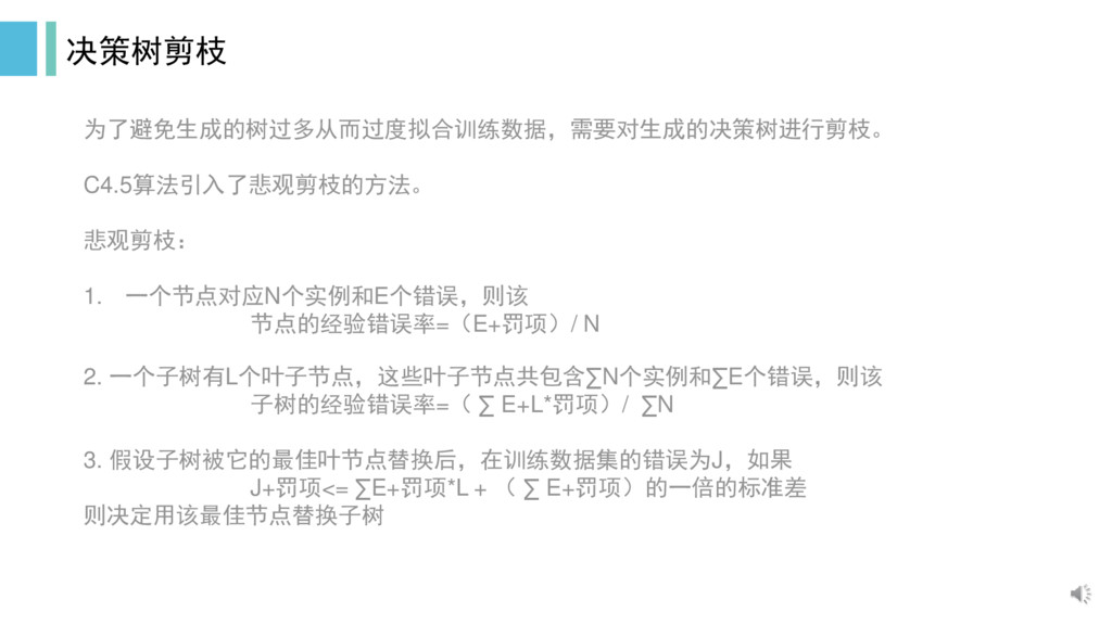 决策树剪枝 为了避免生成的树过多从而过度拟合训练数据,需要对生成的决策树进行剪枝。 C4.5算法引入了悲观剪枝的方法。 悲观剪枝: 1. 一个节点对应N个实例和E个错误,则该 节点的经验错误率=(E+罚项)/ N 2. 一个子树有L个叶子节点,这些叶子节点共包含∑N个实例和∑E个错误,则该