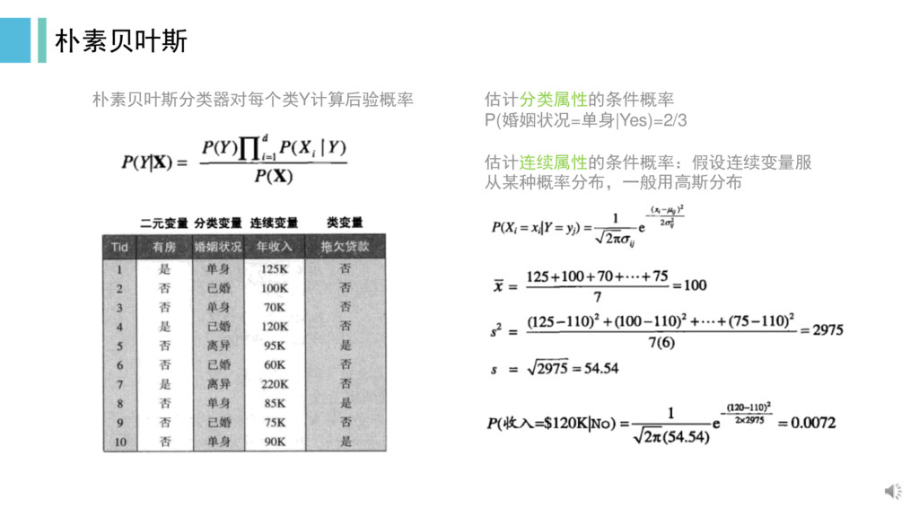 估计分类属性的条件概率 P(婚姻状况=单身|Yes)=2/3 估计连续属性的条件概率:假设连续变量服 从某种概率分布,一般用高斯分布 朴素贝叶斯 朴素贝叶斯分类器对每个类Y计算后验概率
