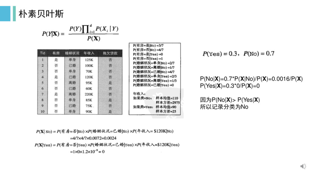 朴素贝叶斯 P(No|X)=0.7*P(X|No)/P(X)=0.0016/P(X) P(Yes|X)=0.3*0/P(X)=0 因为P(No|X)> P(Yes|X) 所以记录分类为No
