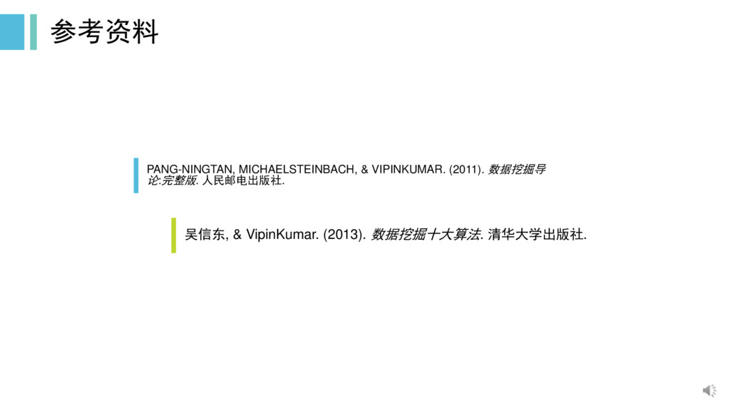 参考资料 PANG-NINGTAN, MICHAELSTEINBACH, & VIPINKUMAR. (2011). 数据挖掘导 论:完整版. 人民邮电出版社. 吴信东,