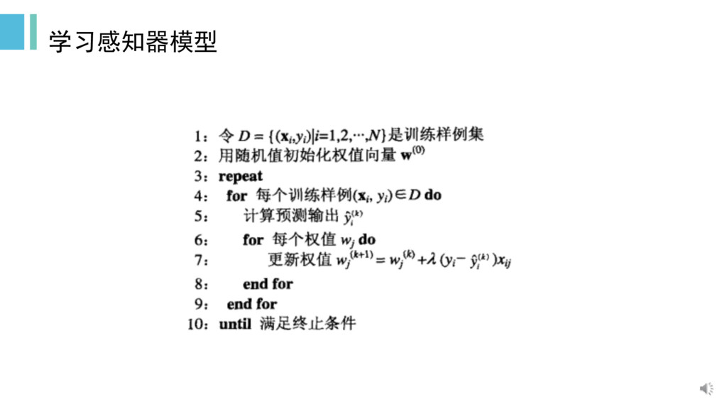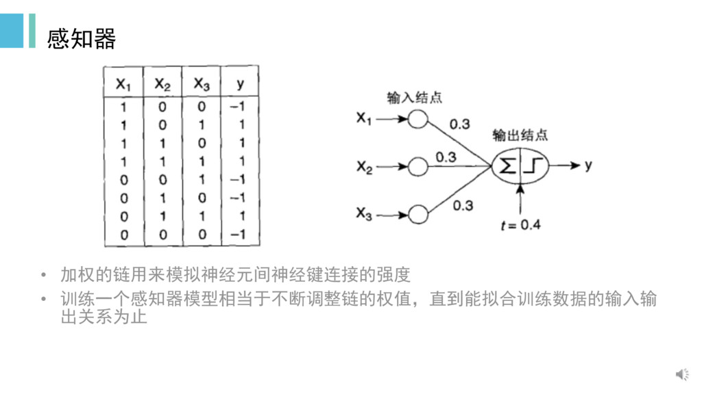 感知器 • 加权的链用来模拟神经元间神经键连接的强度 • 训练一个感知器模型相当于不断调整链的权值,直到能拟合训练数据的输入输 出关系为止