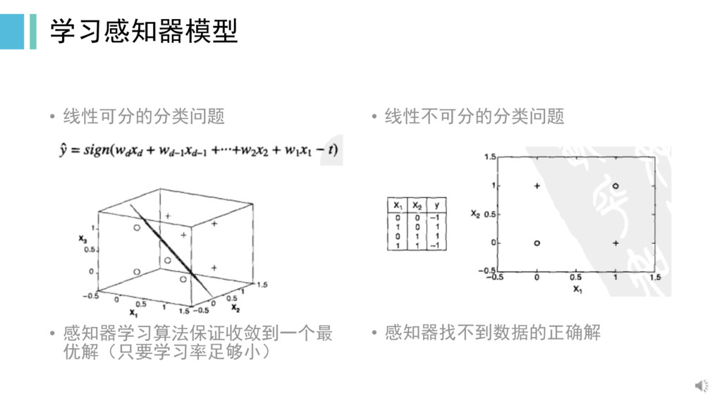 学习感知器模型 • 线性可分的分类问题 • 感知器学习算法保证收敛到一个最 优解(只要学习率足够小) • 线性不可分的分类问题 • 感知器找不到数据的正确解