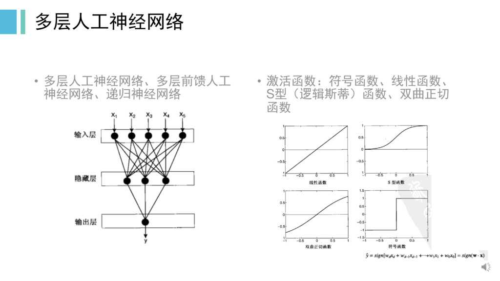 多层人工神经网络 • 多层人工神经网络、多层前馈人工 神经网络、递归神经网络 • 激活函数:符号函数、线性函数、 S型(逻辑斯蒂)函数、双曲正切 函数