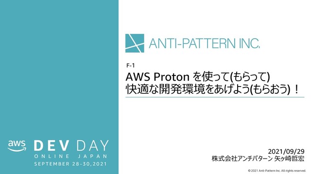 AWS Dev Day Online Japan 2021 ブレイクアウトセッション F-1 でお話させていただきました 「AWS Proton を使って(もらって) 快適な開発環境をあげよう(もらおう)!」のスライドです