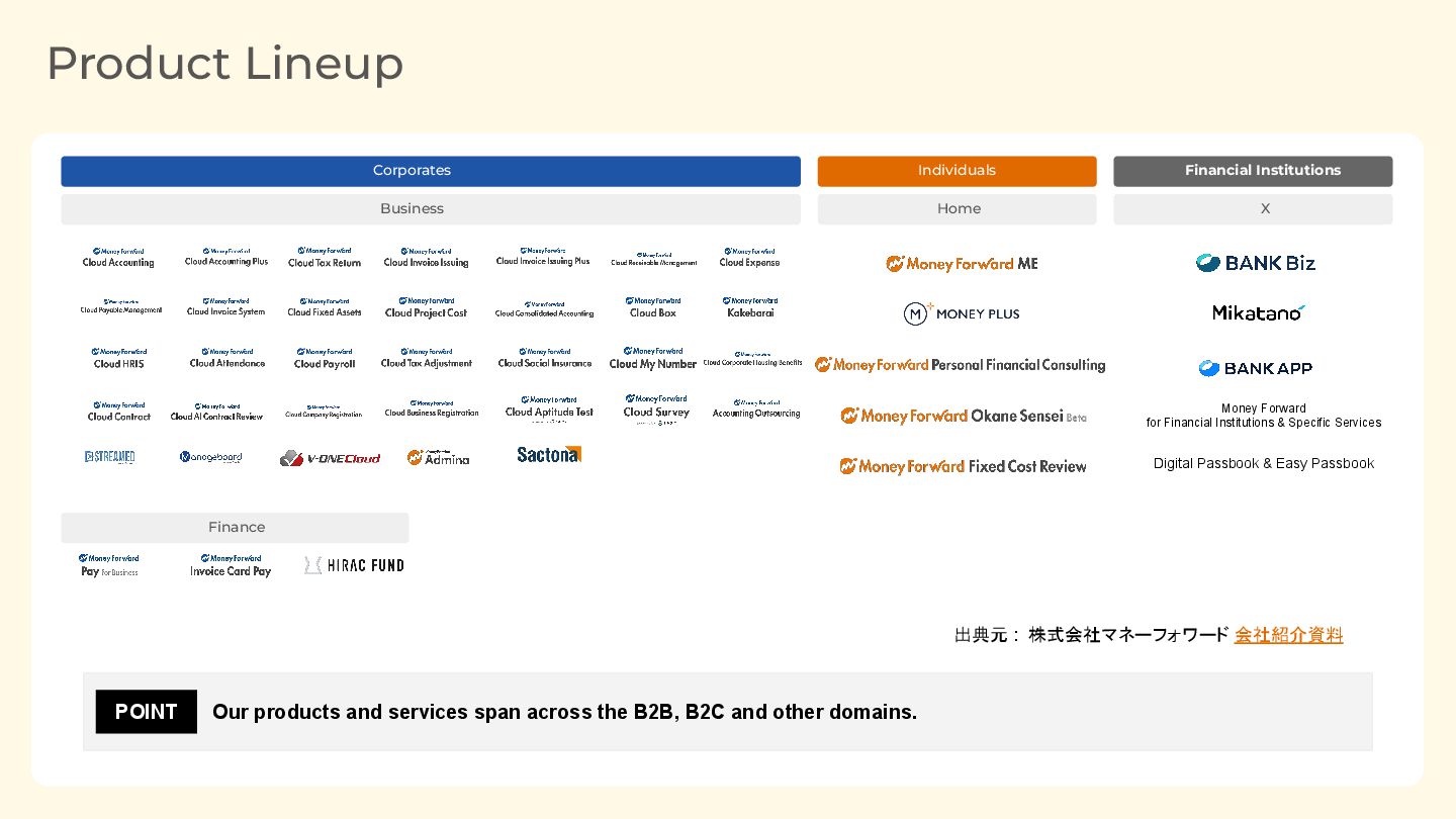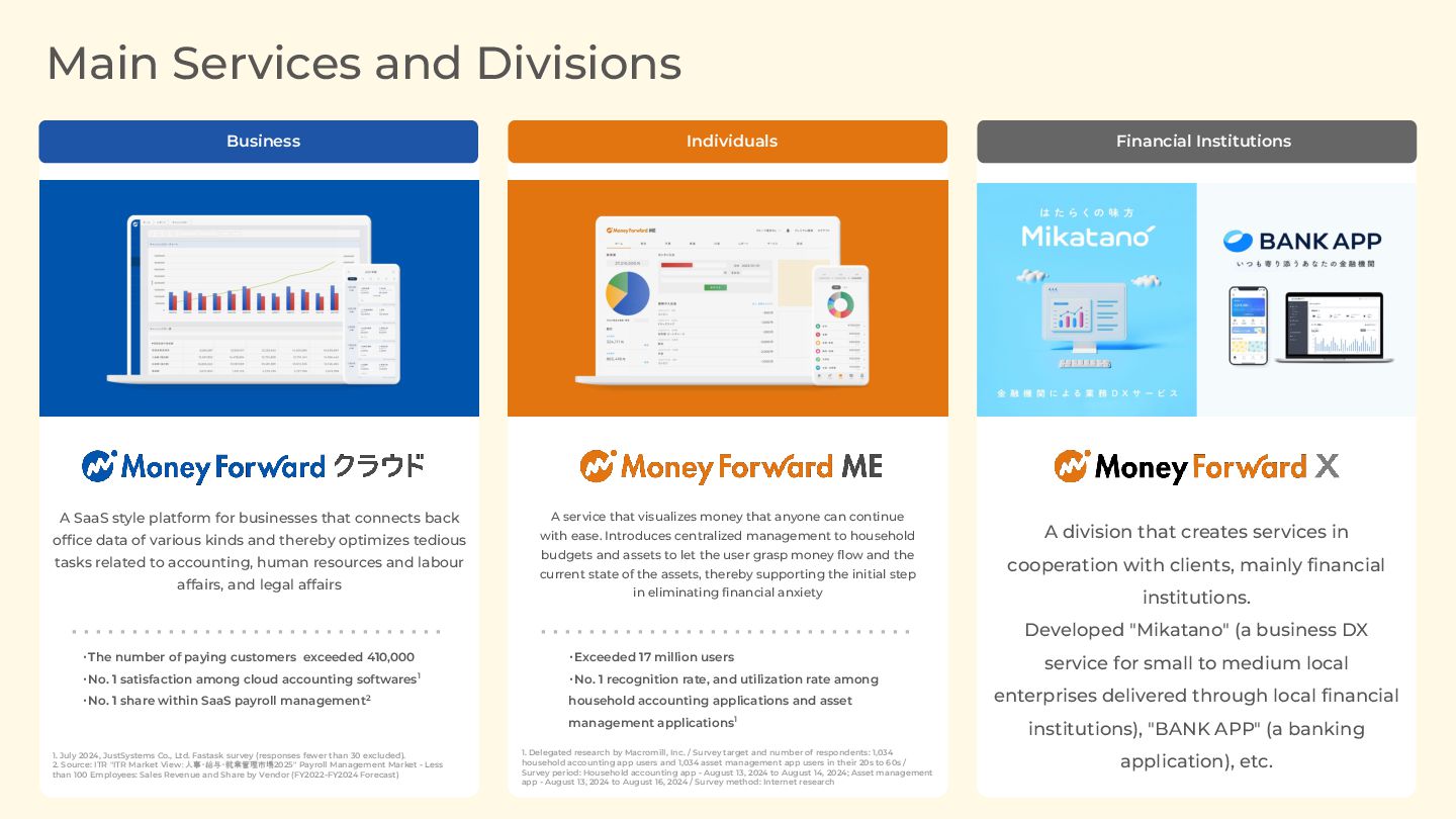 recognition rate, and utilization rate among household accounting applications and asset management applications1 A division that creates services in cooperation with clients, mainly financial institutions. Developed "Mikatano" (a business DX service for small to medium local enterprises delivered through local financial institutions), "BANK APP" (a banking application), etc. A service that visualizes money that anyone can continue with ease. Introduces centralized management to household budgets and assets to let the user grasp money flow and the current state of the assets, thereby supporting the initial step in eliminating financial anxiety ・The number of paying customers exceeded 410,000 ・No. 1 satisfaction among cloud accounting softwares1 ・No. 1 share within SaaS payroll management2 A SaaS style platform for businesses that connects back office data of various kinds and thereby optimizes tedious tasks related to accounting, human resources and labour affairs, and legal affairs 1. Delegated research by Macromill, Inc. / Survey target and number of respondents: 1,034 household accounting app users and 1,034 asset management app users in their 20s to 60s / Survey period: Household accounting app - August 13, 2024 to August 14, 2024; Asset management app - August 13, 2024 to August 16, 2024 / Survey method: Internet research 1. July 2024, JustSystems Co., Ltd. Fastask survey (responses fewer than 30 excluded). 2. Source: ITR "ITR Market View:人事・給与・就業管理市場2025" Payroll Management Market - Less than 100 Employees: Sales Revenue and Share by Vendor (FY2022-FY2024 Forecast) Business Individuals Financial Institutions