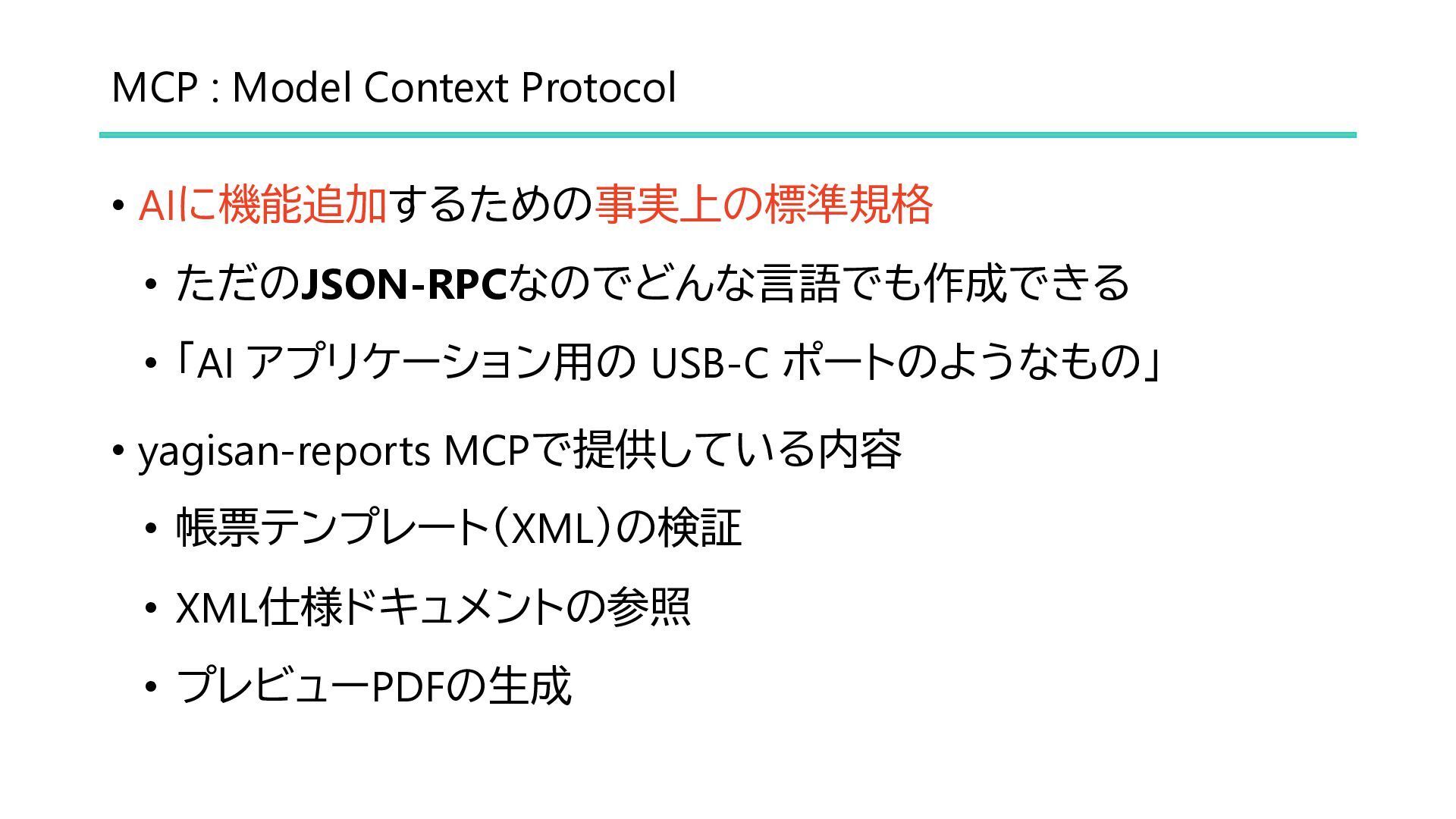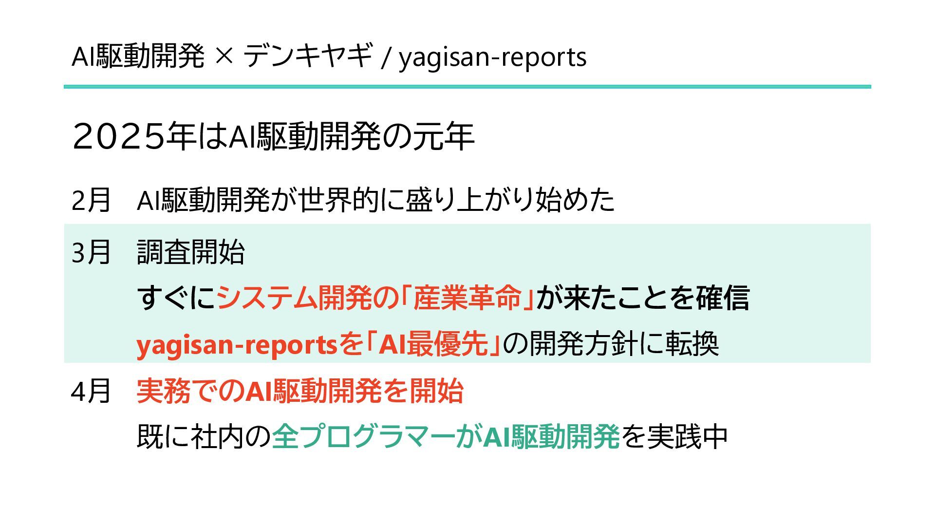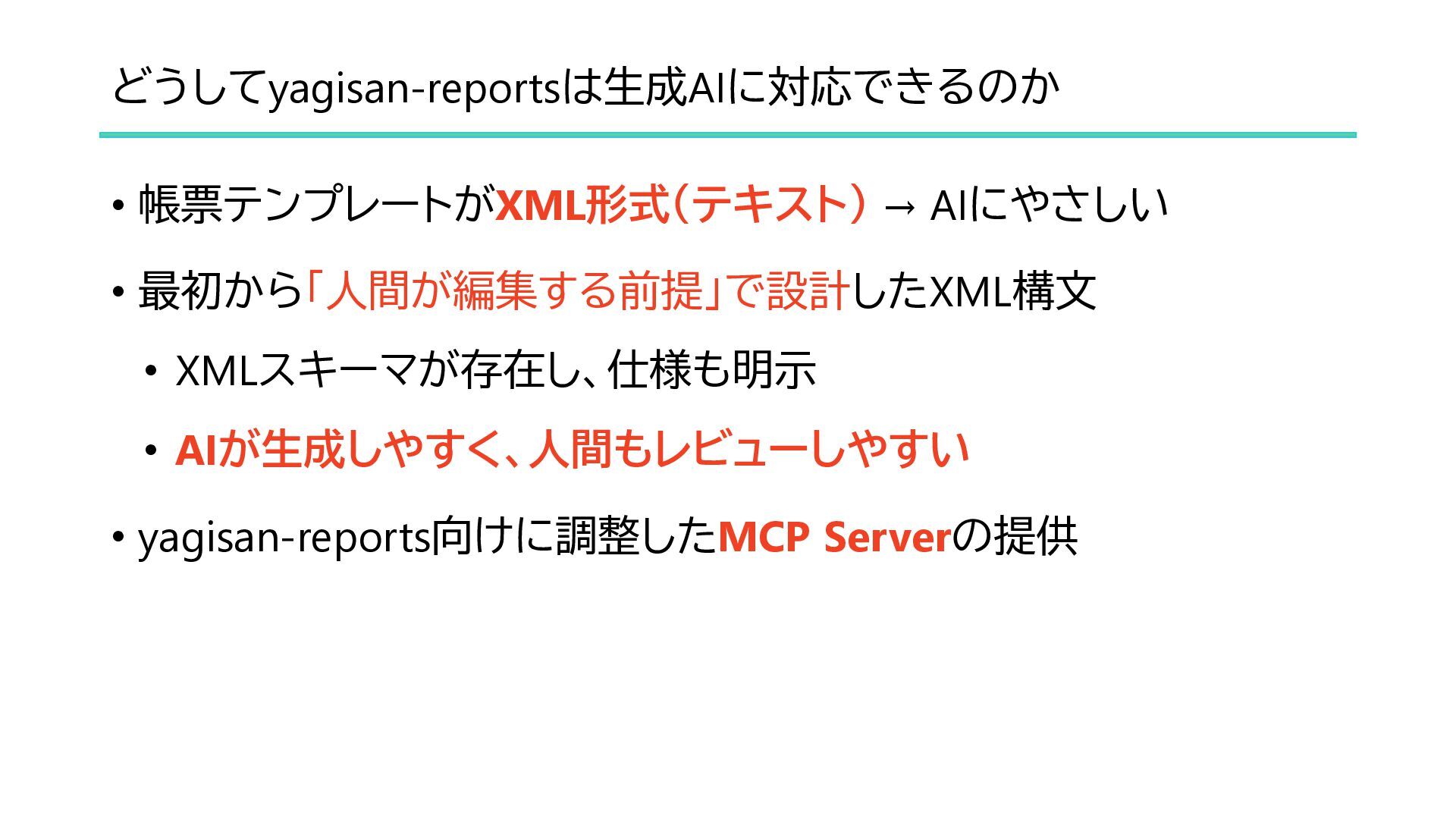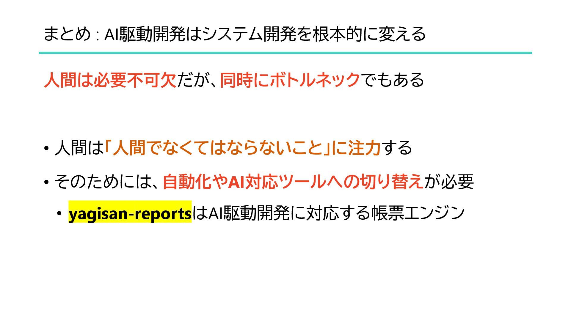 AI駆動開発の現状解説と、yagisan-reportsのAI対応のご紹介です。 デモ動画リンク: https://www.youtube.com/watch?v=H40ldLkF_tI