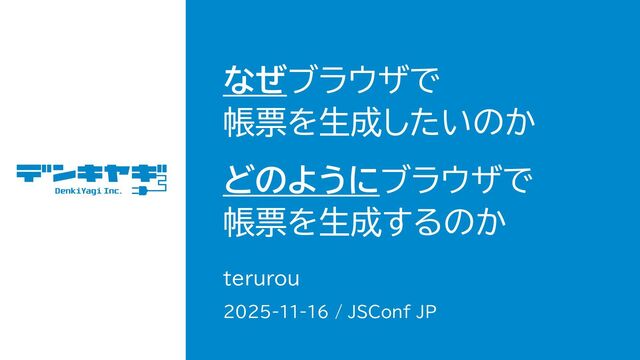 なぜブラウザで 帳票を生成したいのか terurou 2025-11-16 / JSConf JP どのようにブラウザで 帳票を生成するのか