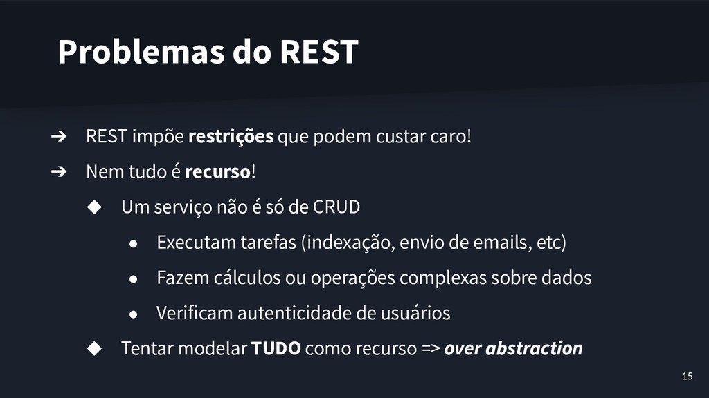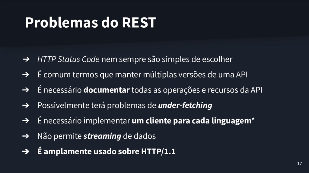O REST é ainda hoje a opção mais usada para criação de APIs para comunicação entre processos sobre rede, embora em muitos casos não seja realmente uma escolha, mas um uso pelo fato de ser simples e amplamente usado e conhecido. Por outro lado, soluções como gRPC e GraphQL vêm crescendo e se popularizando cada vez mais como alternativa ao “plain old” REST.