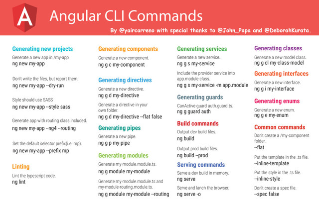 ng new my-app ng new my-app --dry-run ng g c my-component ng g s my-service Generate a new app in /my-app Don’t write the files, but report them. Generate a new component. Generate a new service. ng new my-app --ng4 --routing Generate app with routing class included. ng new my-app --style sass ng new my-app --prefix mp Style should use SASS Set the default selector prefix(i.e. mp). Generating directives ng g d my-directive Generate a new directive. Generating interfaces ng g i my-interface Generate a new interface. Generating pipes ng g p my-pipe Generate a new pipe. Build commands ng build Output dev build files. Generating modules ng g module my-module Generate my-module.module.ts. Serving commands ng serve Serve a dev build in memory. Generating classes ng g cl my-class-model Generate a new model class. Generating enums ng g e my-enum Generate a new enum. Generating guards ng g guard auth CanActive guard auth.guard.ts. Common commands --flat Don’t create a /my-component folder. ng serve -o Serve and lanch the browser. ng g d my-directive --flat false Generate a directive in your own folder. ng build --prod Output prod build files. ng g s my-service -m app.module Include the provider service into app.module class. ng g module my-module --routing Generate my-module.module.ts and my-module-routing.module.ts. --inline-template Put the template in the .ts file. --inline-style Put the style in the .ts file. --spec false Don’t create a spec file. Linting ng lint Lint the typescript code. By @yaircarreno with special thanks to @John_Papa and @DeborahKurata.