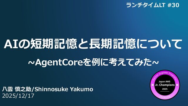 AIの短期記憶と長期記憶について ~AgentCoreを例に考えてみた~ 八雲 慎之助/Shinnosuke Yakumo 2025/12/17 ランチタイムLT #30