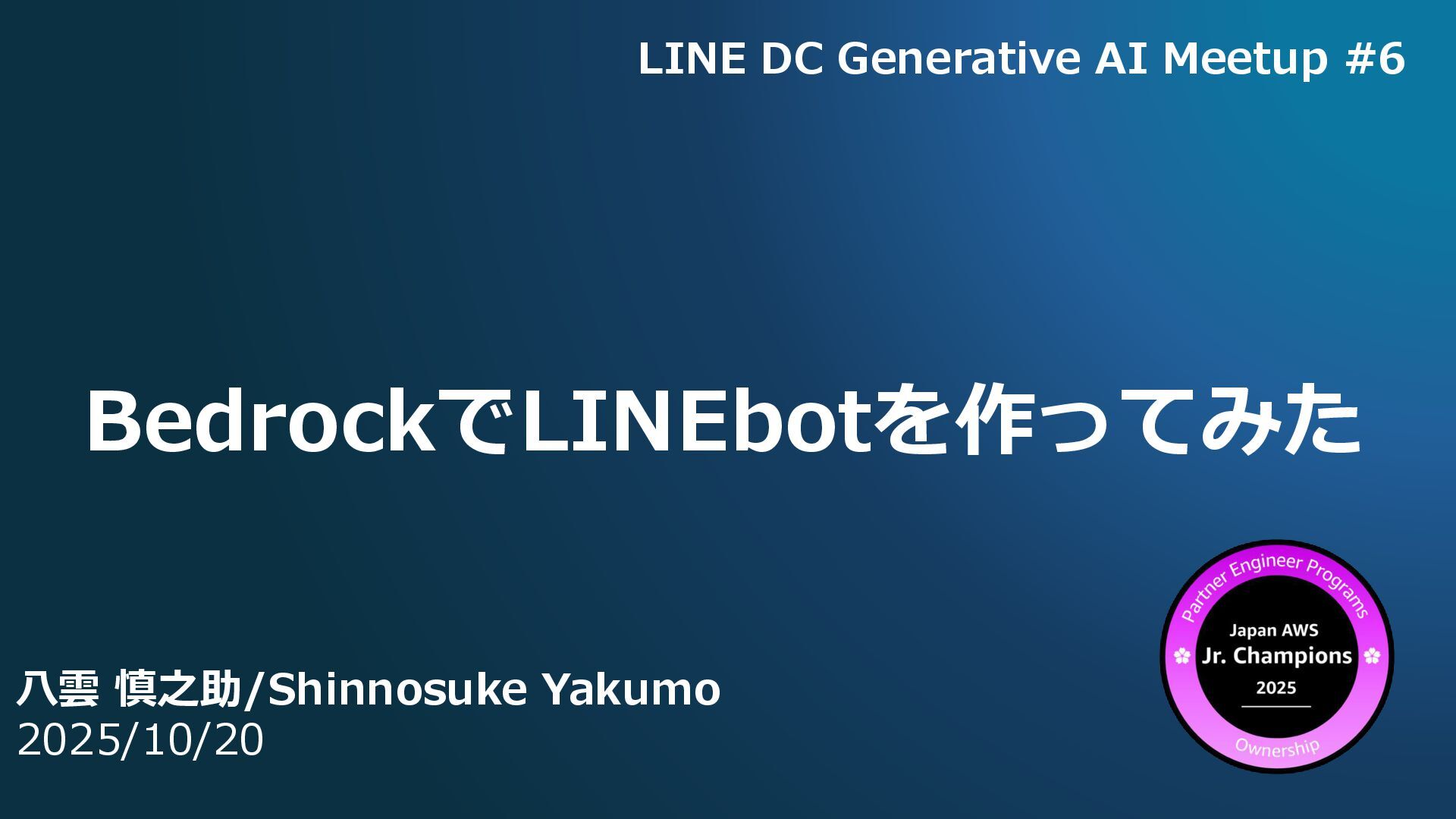 BedrockでLINEbotを作ってみた 八雲 慎之助/Shinnosuke Yakumo 2025/10/20 LINE DC Generative AI Meetup