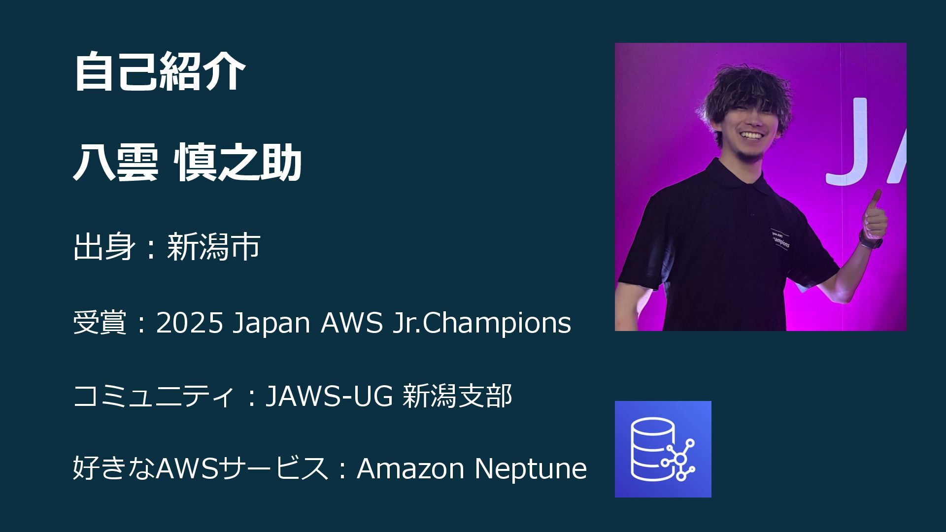 自己紹介 八雲 慎之助 出身:新潟市 受賞:2025 Japan AWS Jr.Champions コミュニティ:JAWS-UG 新潟支部