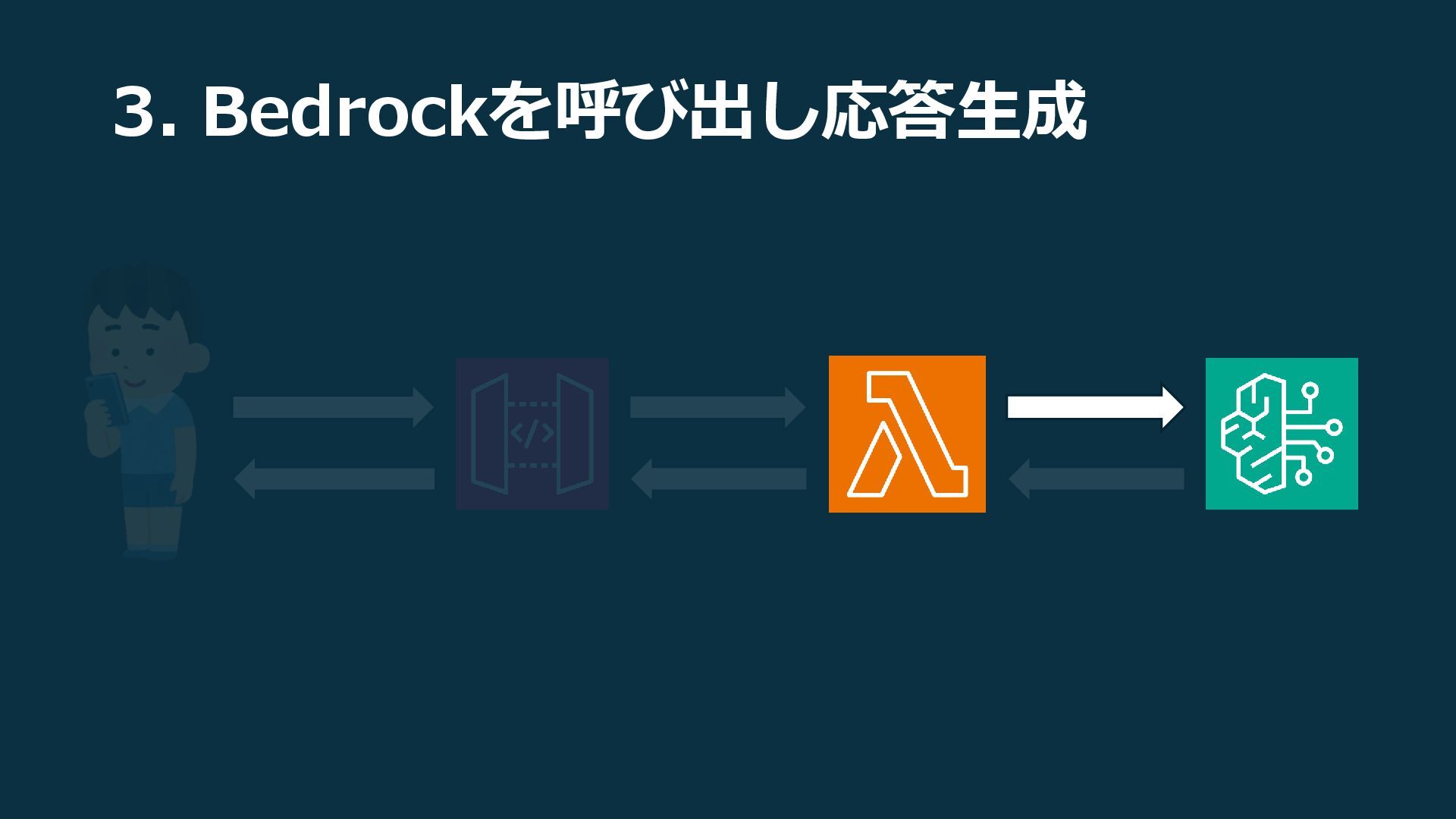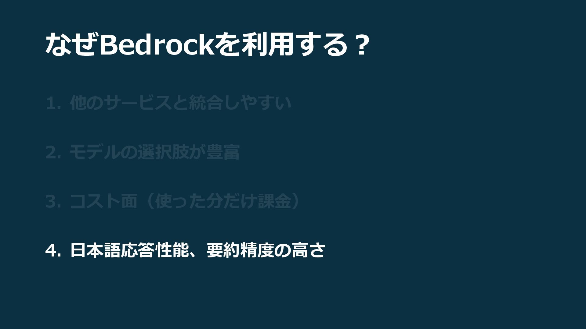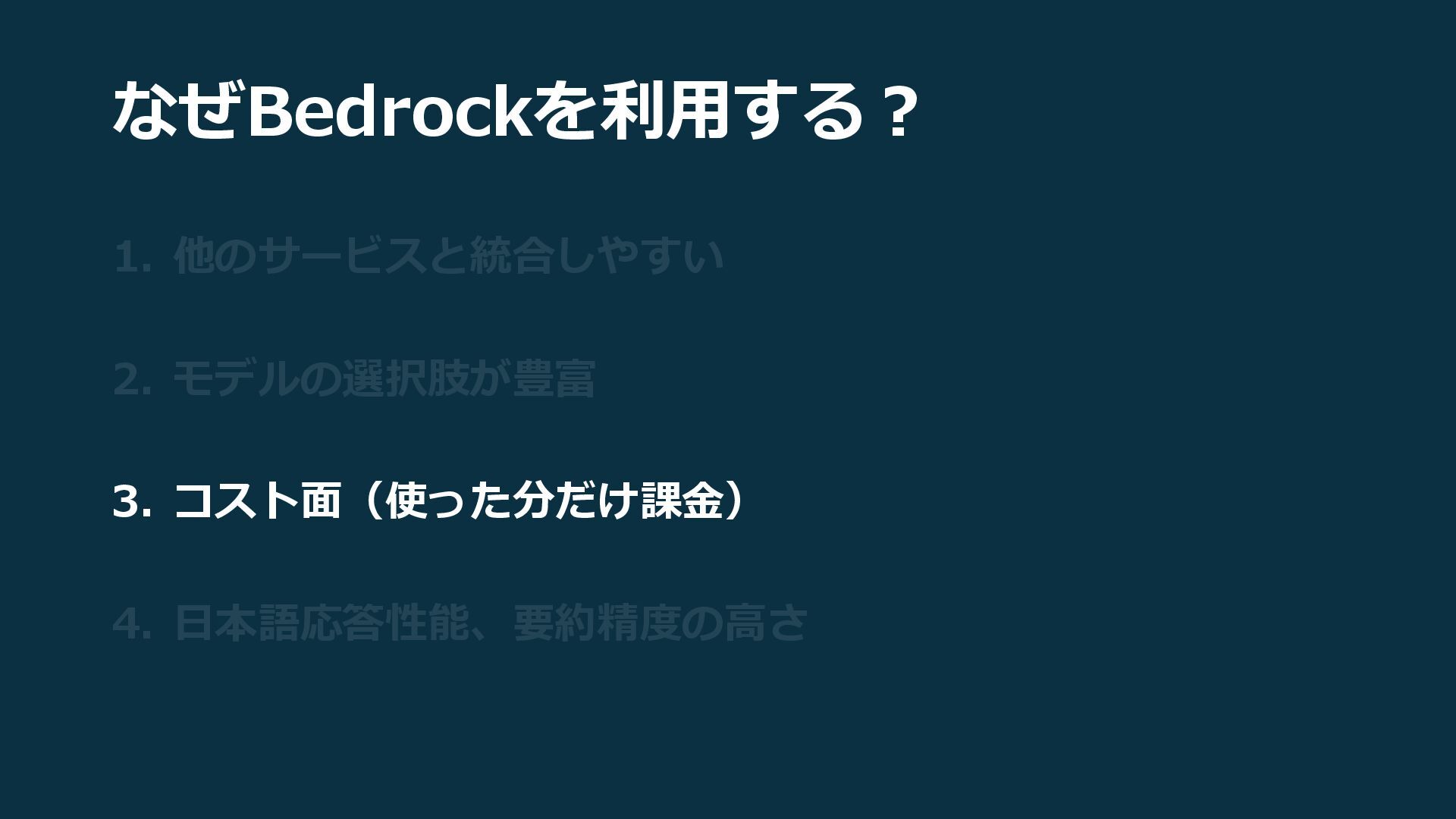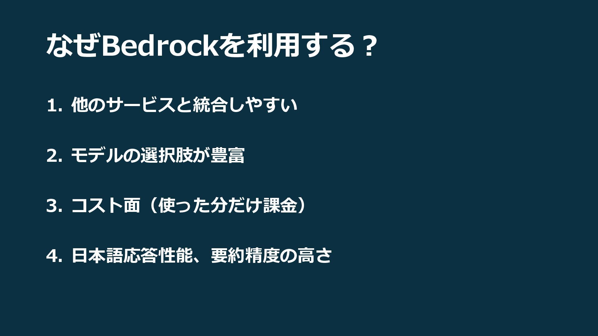 なぜBedrockを利用する? 1. 他のサービスと統合しやすい 2. モデルの選択肢が豊富 3. コスト面(使った分だけ課金) 4. 日本語応答性能、要約精度の高さ