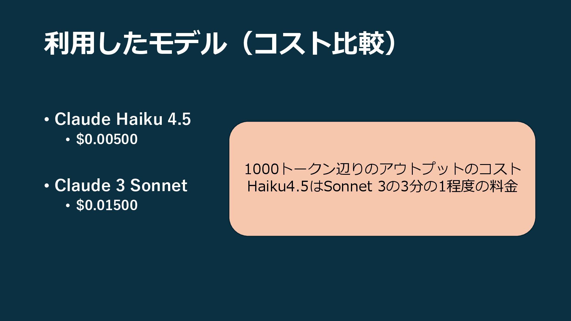 利用したモデル(コスト比較) • Claude Haiku 4.5 • $0.00500 • Claude 3