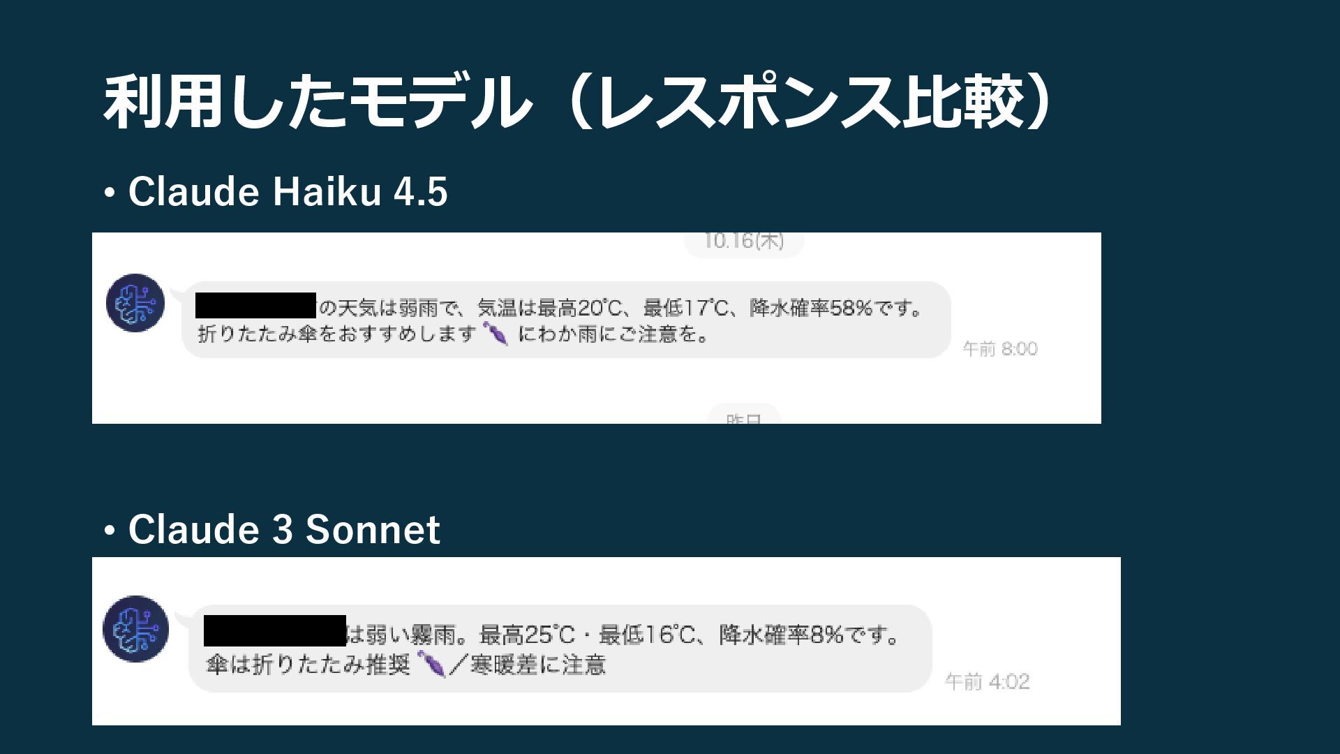 利用したモデル(レスポンス比較) • Claude Haiku 4.5 • Claude 3 Sonnet