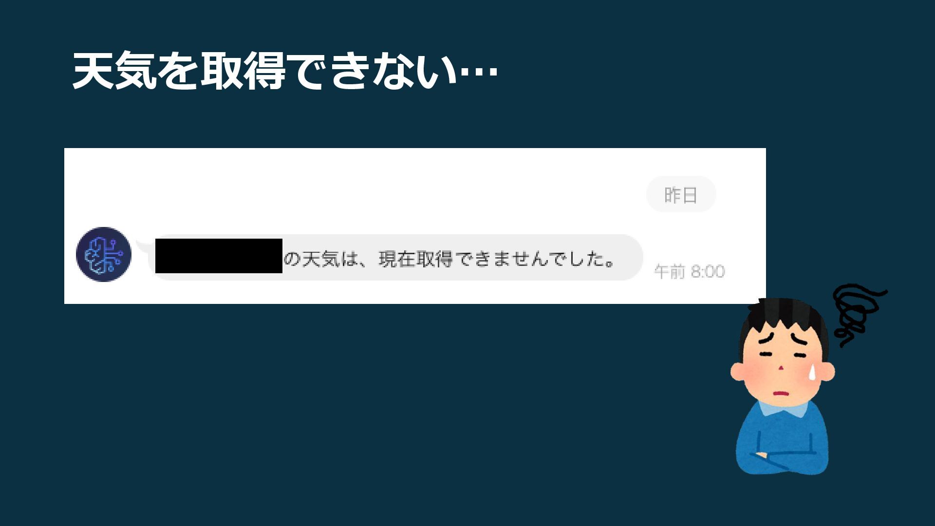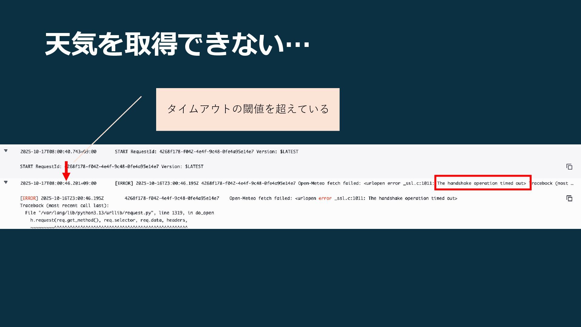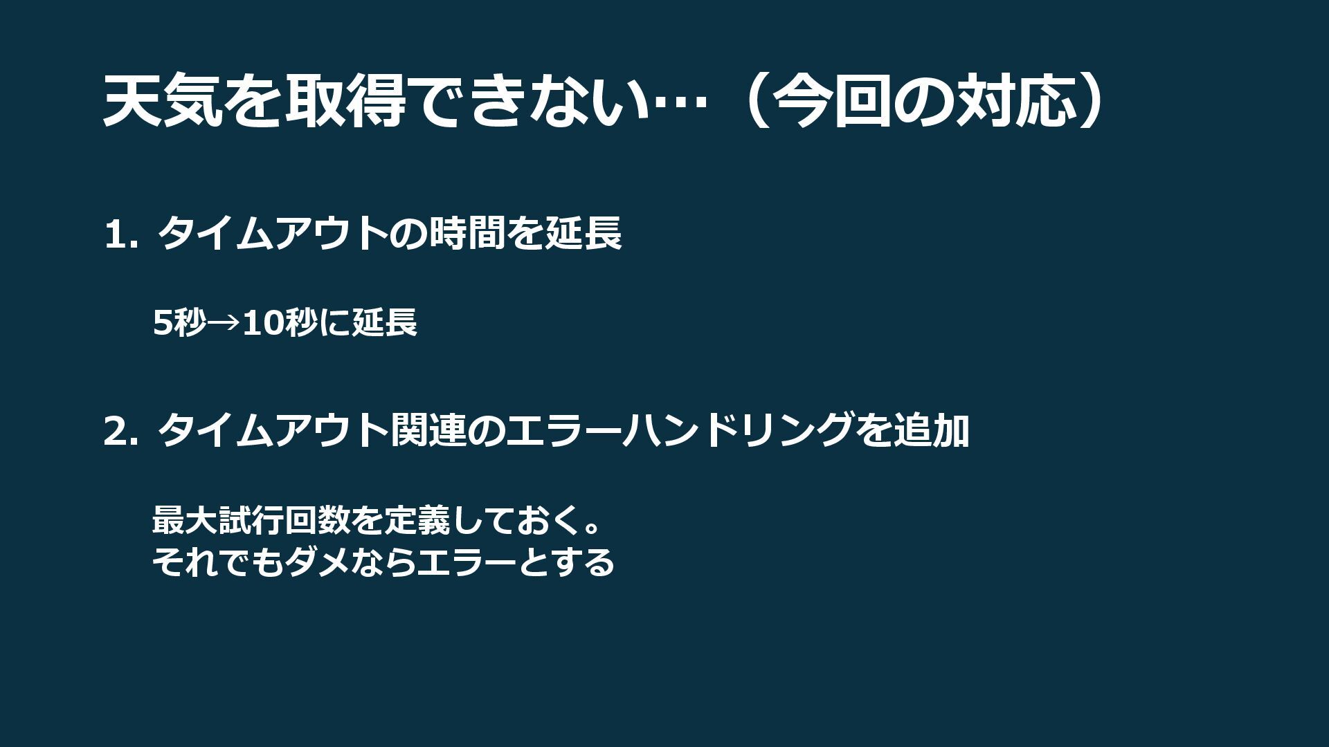 天気を取得できない…(今回の対応) 1. タイムアウトの時間を延長 5秒→10秒に延長 2. タイムアウト関連のエラーハンドリングを追加 最大試行回数を定義しておく。 それでもダメならエラーとする