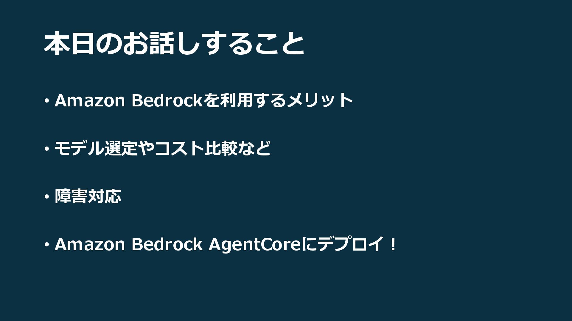 本日のお話しすること • Amazon Bedrockを利用するメリット • モデル選定やコスト比較など • 障害対応 • Amazon