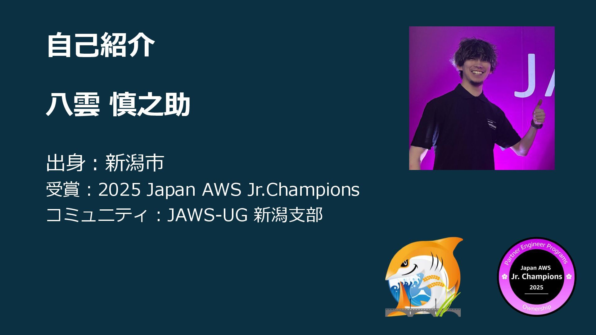 八雲 慎之助 出身:新潟市 受賞:2025 Japan AWS Jr.Champions コミュニティ:JAWS-UG 新潟支部 自己紹介