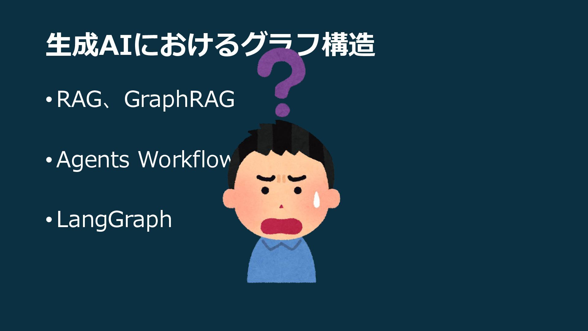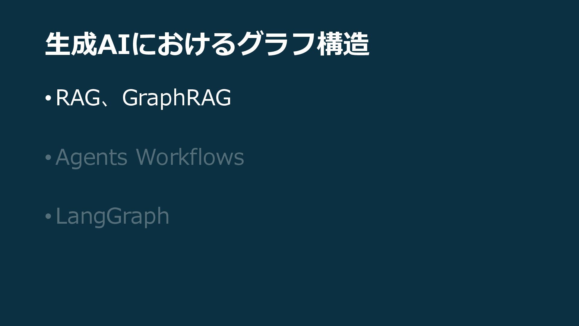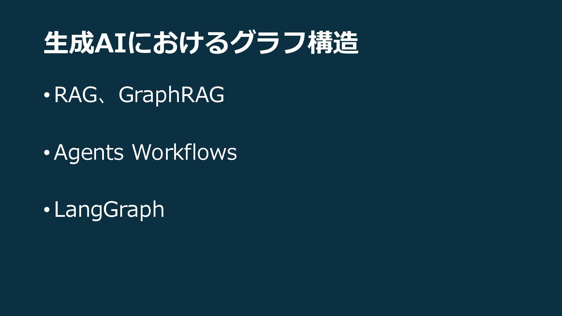 生成AIにおけるグラフ構造 •RAG、GraphRAG •Agents Workflows •LangGraph