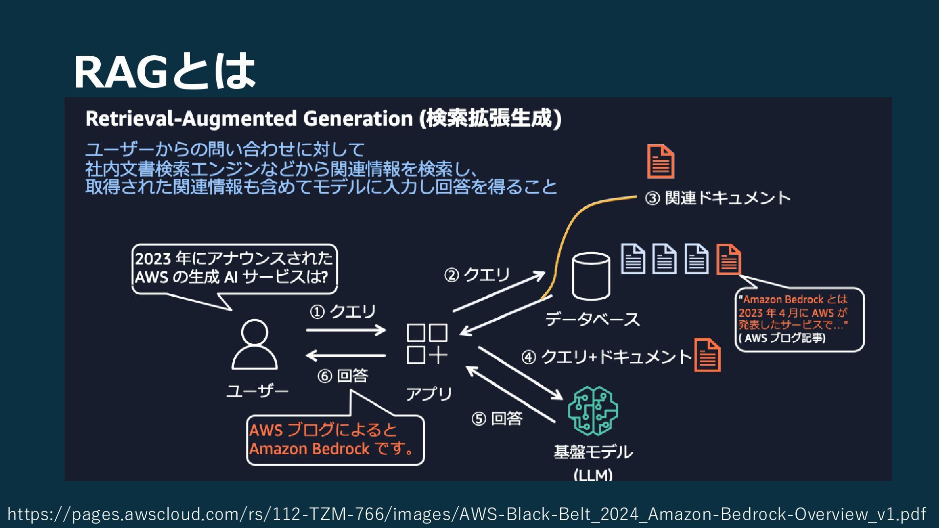RAGとは https://pages.awscloud.com/rs/112-TZM-766/images/AWS-Black-Belt_2024_Amazon-Bedrock-Overview_v1.pdf