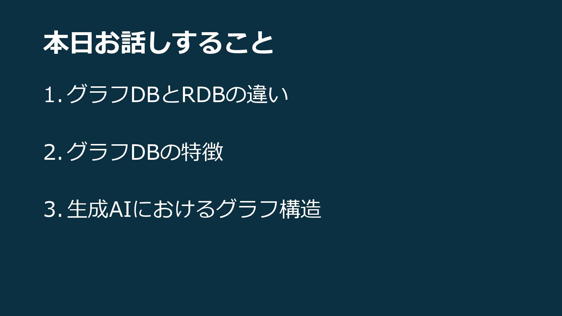 本日お話しすること 1. グラフDBとRDBの違い 2. グラフDBの特徴 3. 生成AIにおけるグラフ構造