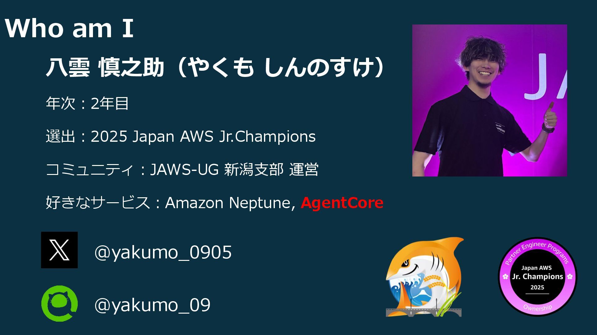 運営 好きなサービス:Amazon Neptune, AgentCore Who am I @yakumo_09 @yakumo_0905