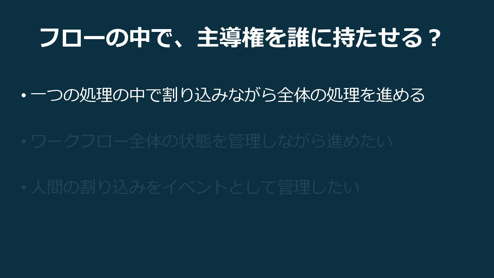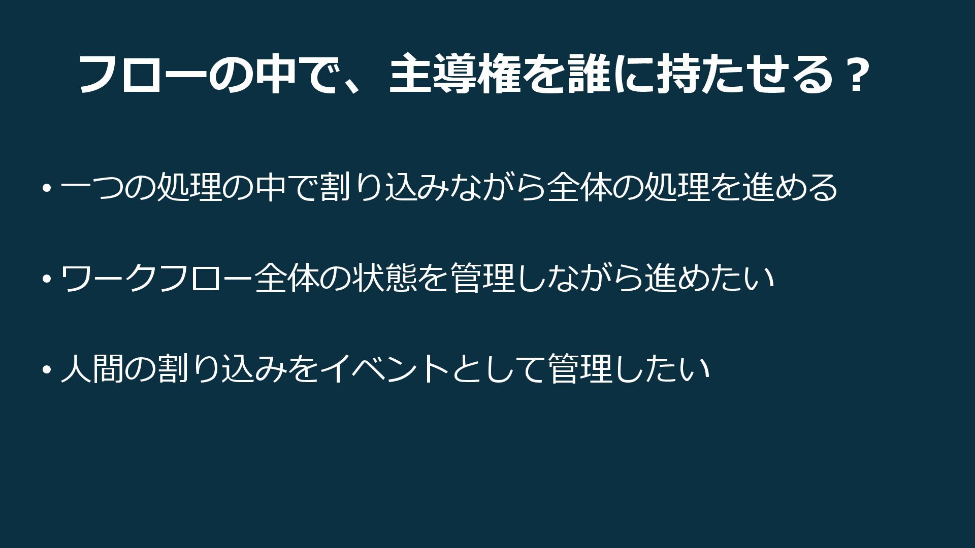 フローの中で、主導権を誰に持たせる? • 一つの処理の中で割り込みながら全体の処理を進める • ワークフロー全体の状態を管理しながら進めたい • 人間の割り込みをイベントとして管理したい