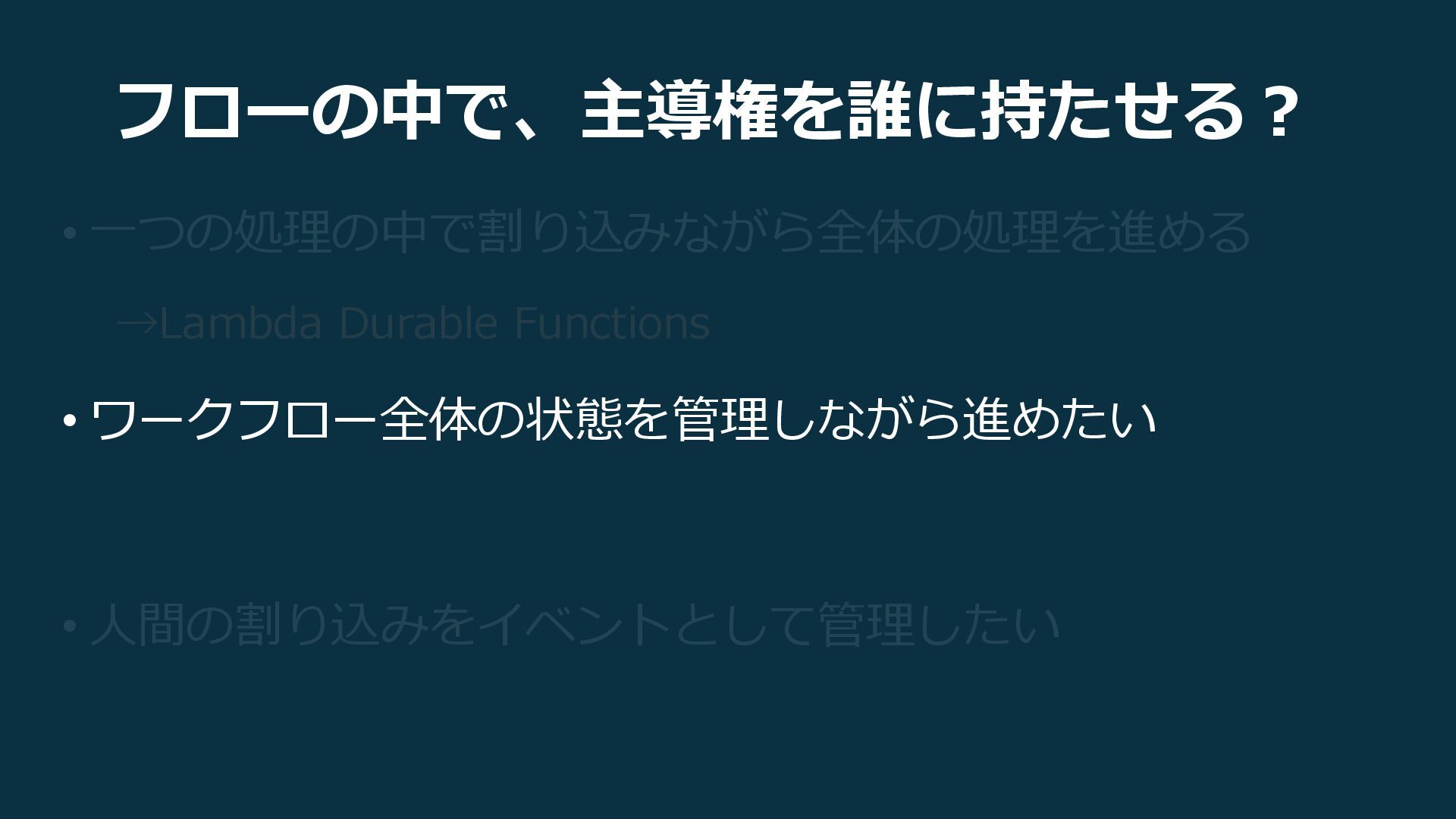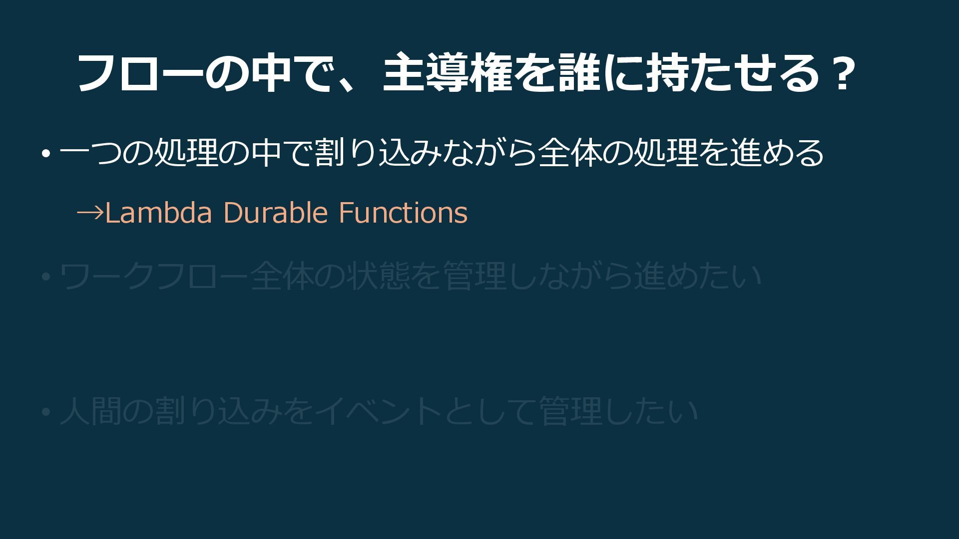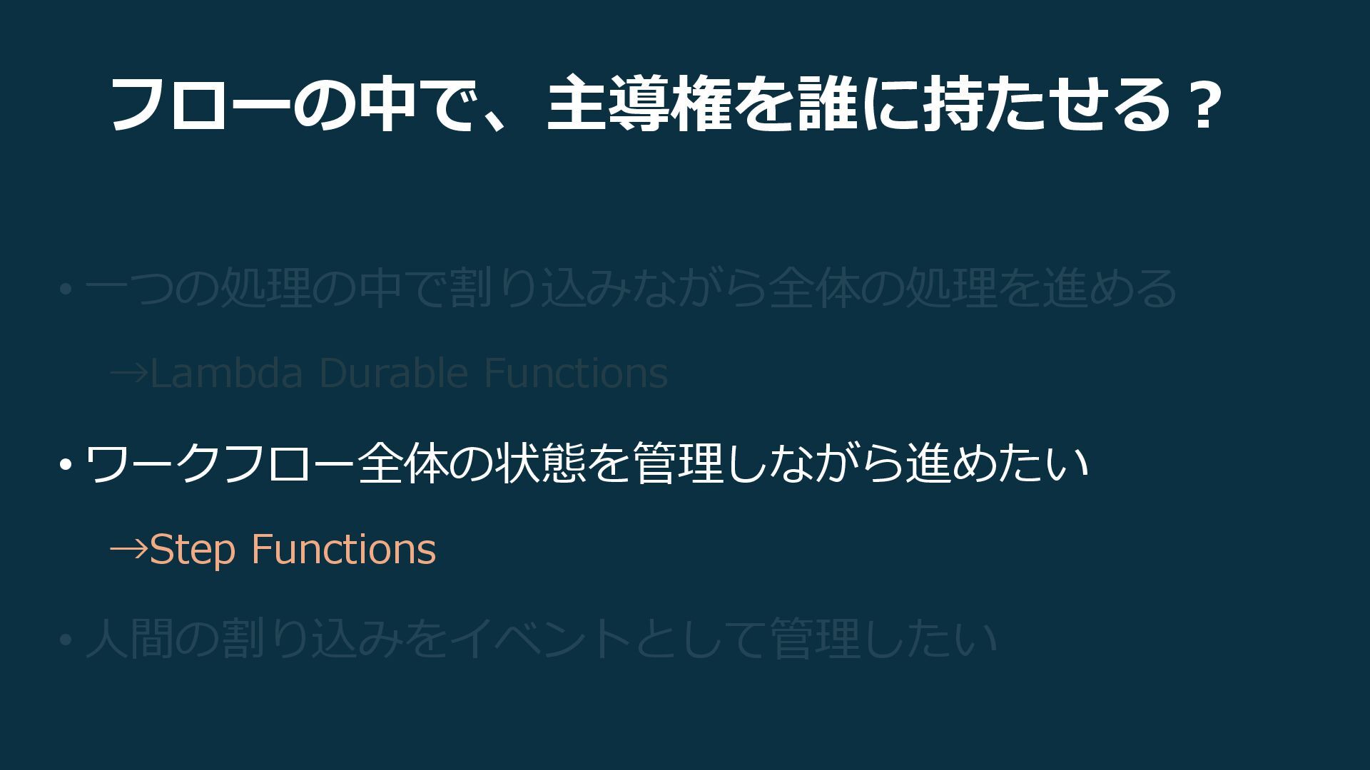 フローの中で、主導権を誰に持たせる? • 一つの処理の中で割り込みながら全体の処理を進める →Lambda Durable Functions • ワークフロー全体の状態を管理しながら進めたい →Step Functions