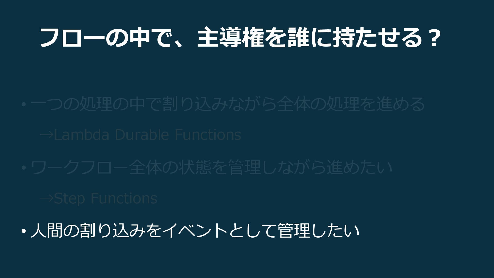 フローの中で、主導権を誰に持たせる? • 一つの処理の中で割り込みながら全体の処理を進める →Lambda Durable Functions • ワークフロー全体の状態を管理しながら進めたい • 人間の割り込みをイベントとして管理したい