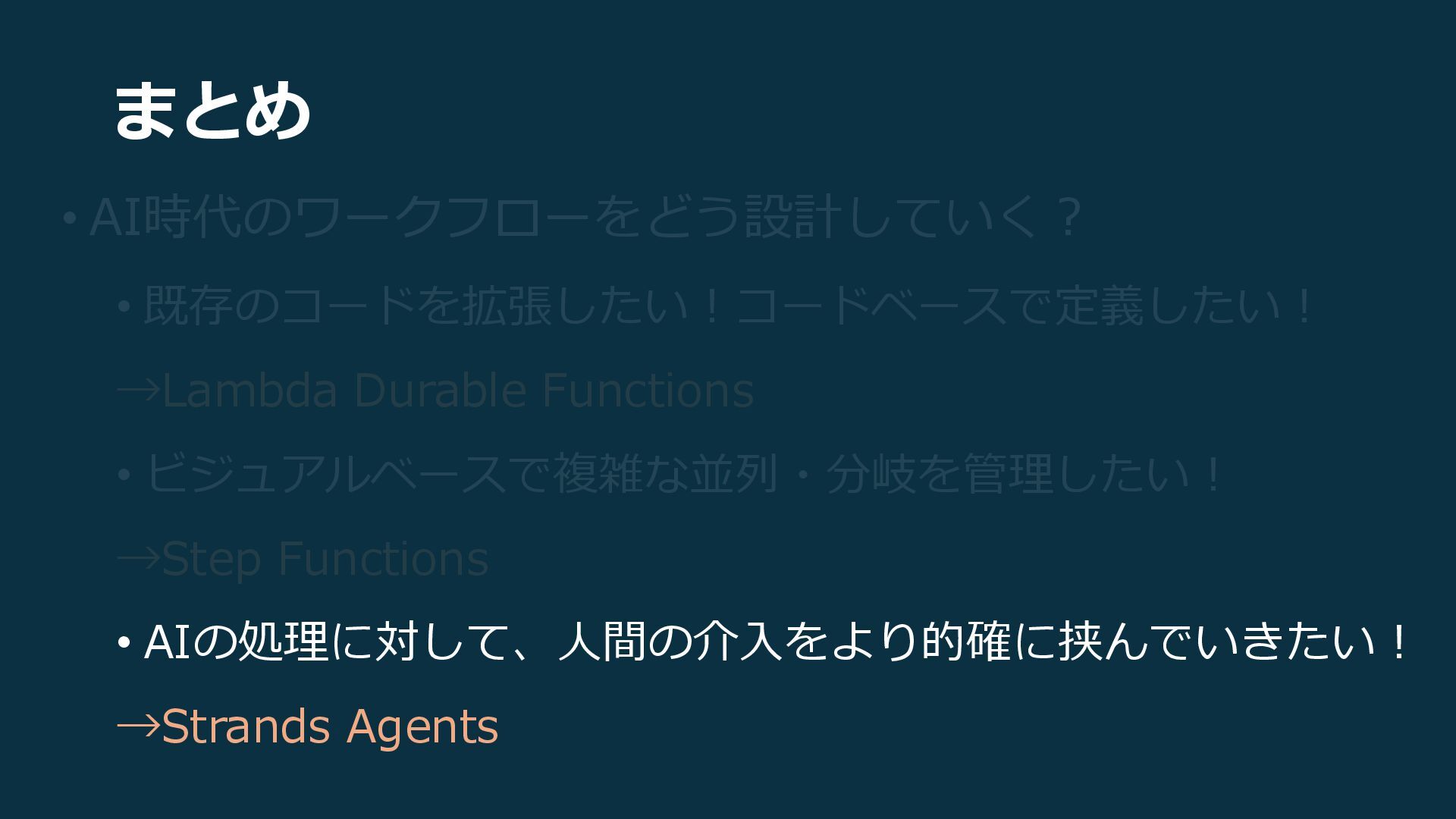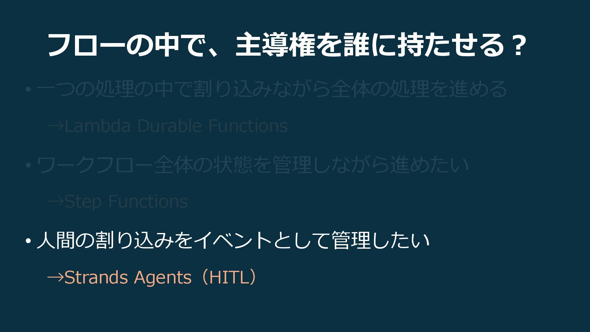 →Step Functions • AIの処理に対して、人間の介入をより的確に挟んでいきたい! →Strands Agents
