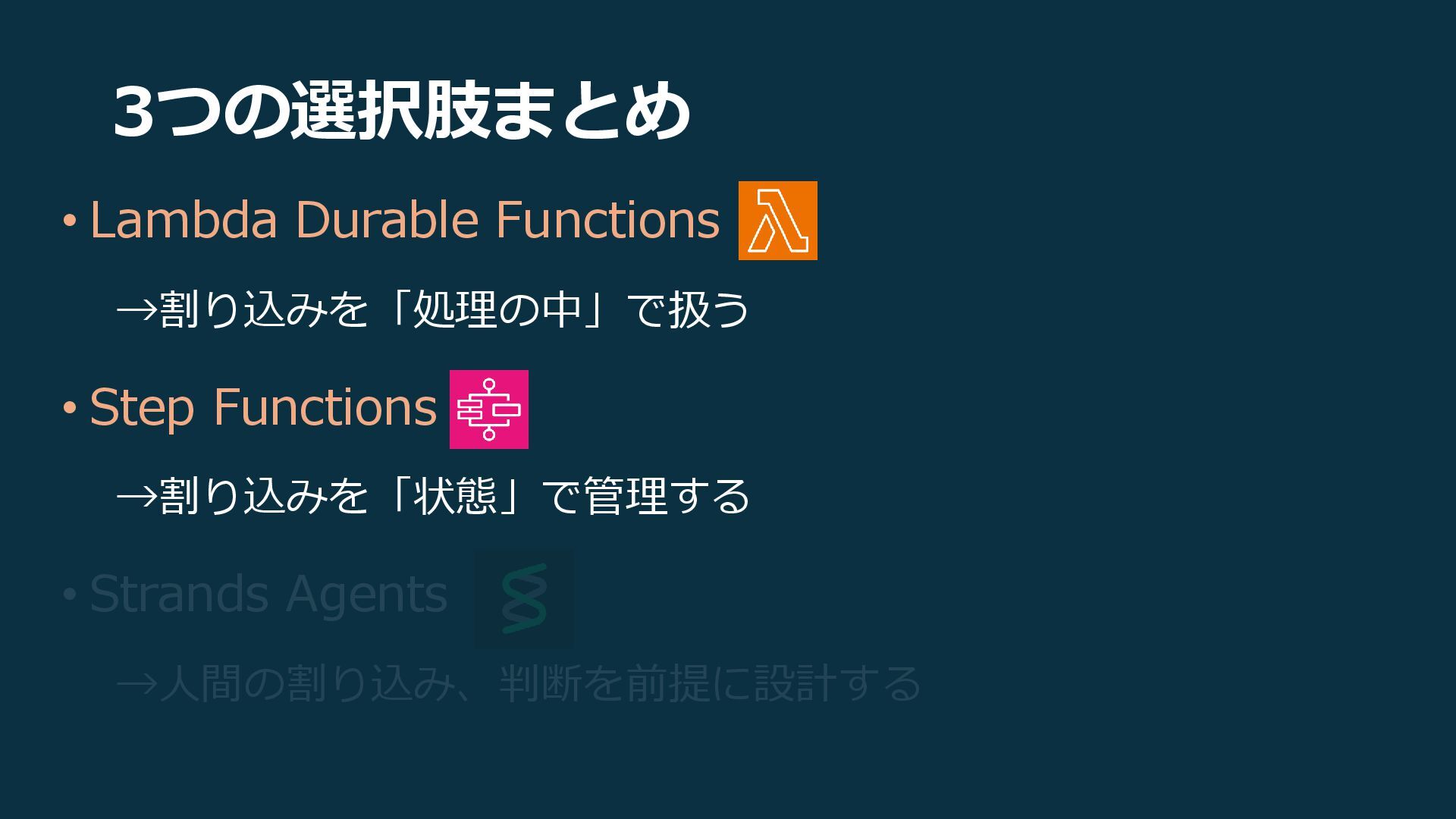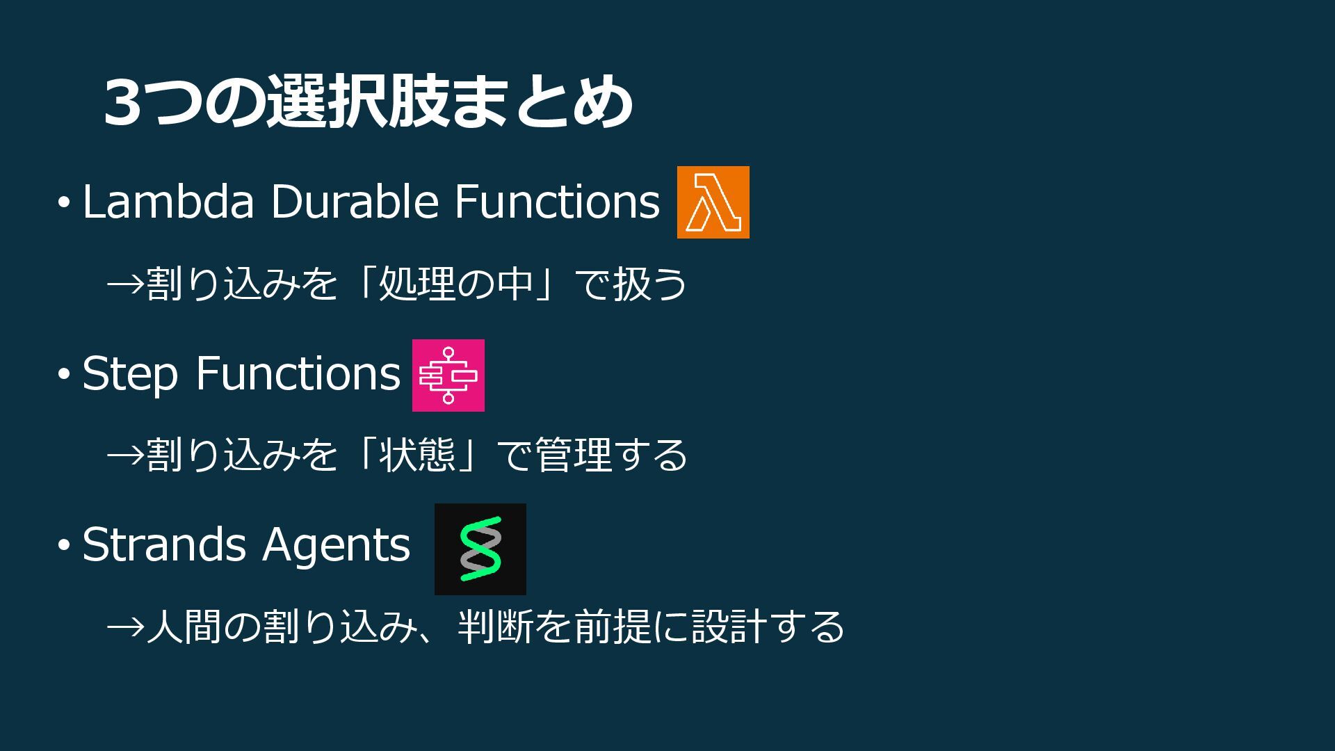 3つの選択肢まとめ • Lambda Durable Functions →割り込みを「処理の中」で扱う • Step Functions →割り込みを「状態」で管理する