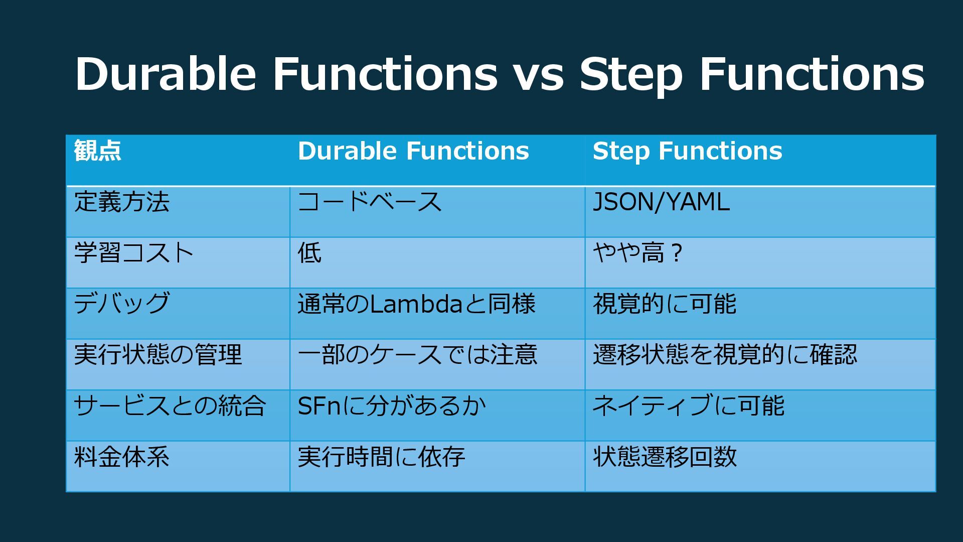 定義方法 コードベース JSON/YAML 学習コスト 低 やや高? デバッグ 通常のLambdaと同様 視覚的に可能 実行状態の管理 一部のケースでは注意 遷移状態を視覚的に確認 サービスとの統合 SFnに分があるか ネイティブに可能 料金体系 実行時間に依存 状態遷移回数