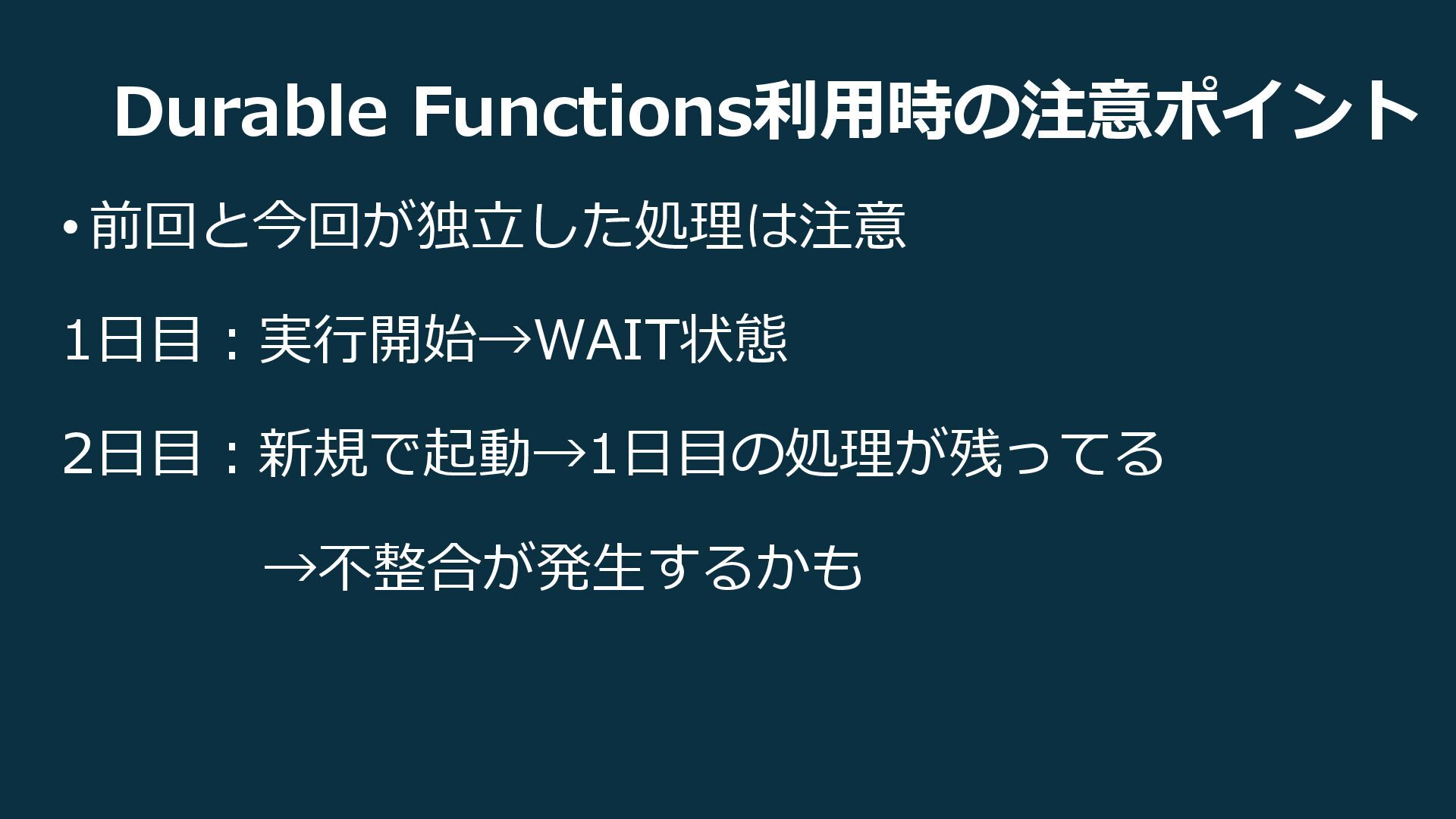 Durable Functions利用時の注意ポイント •前回と今回が独立した処理は注意 1日目:実行開始→WAIT状態 2日目:新規で起動→1日目の処理が残ってる →不整合が発生するかも