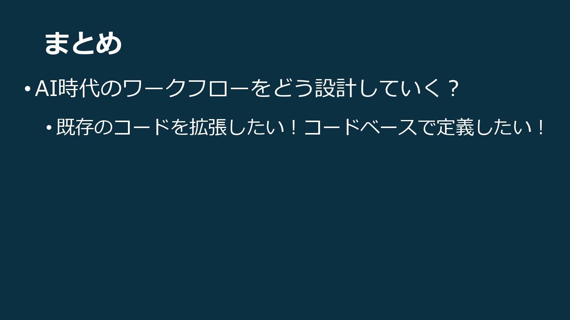まとめ •AI時代のワークフローをどう設計していく? • 既存のコードを拡張したい!コードベースで定義したい!