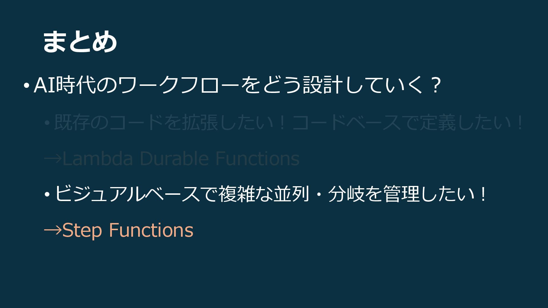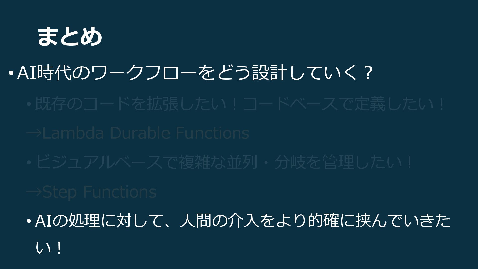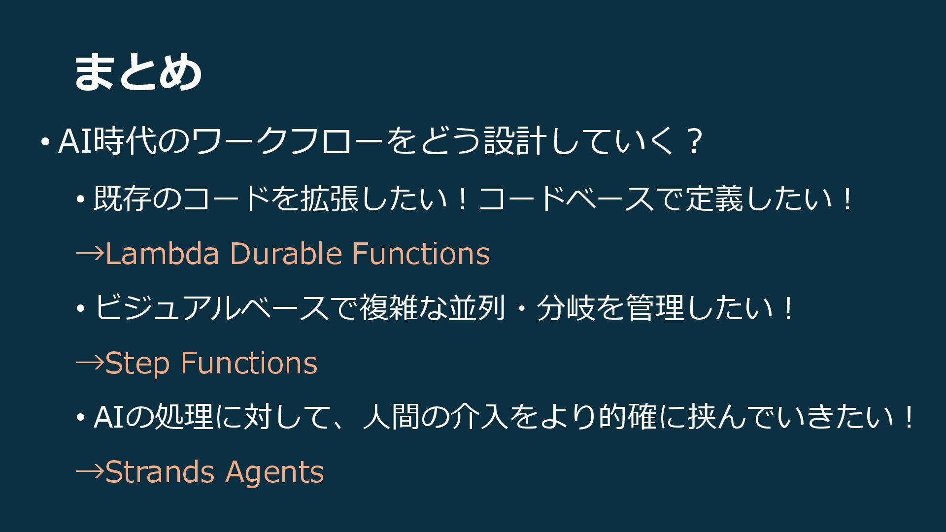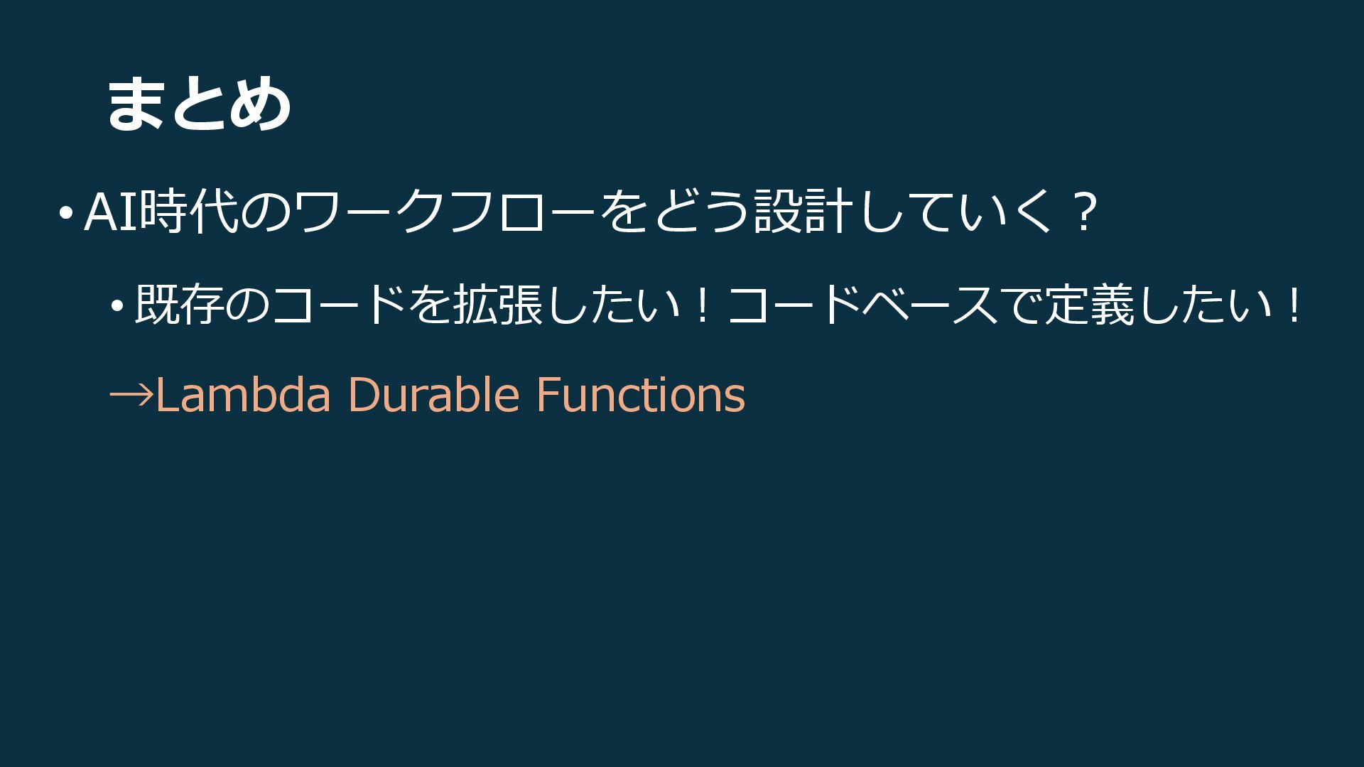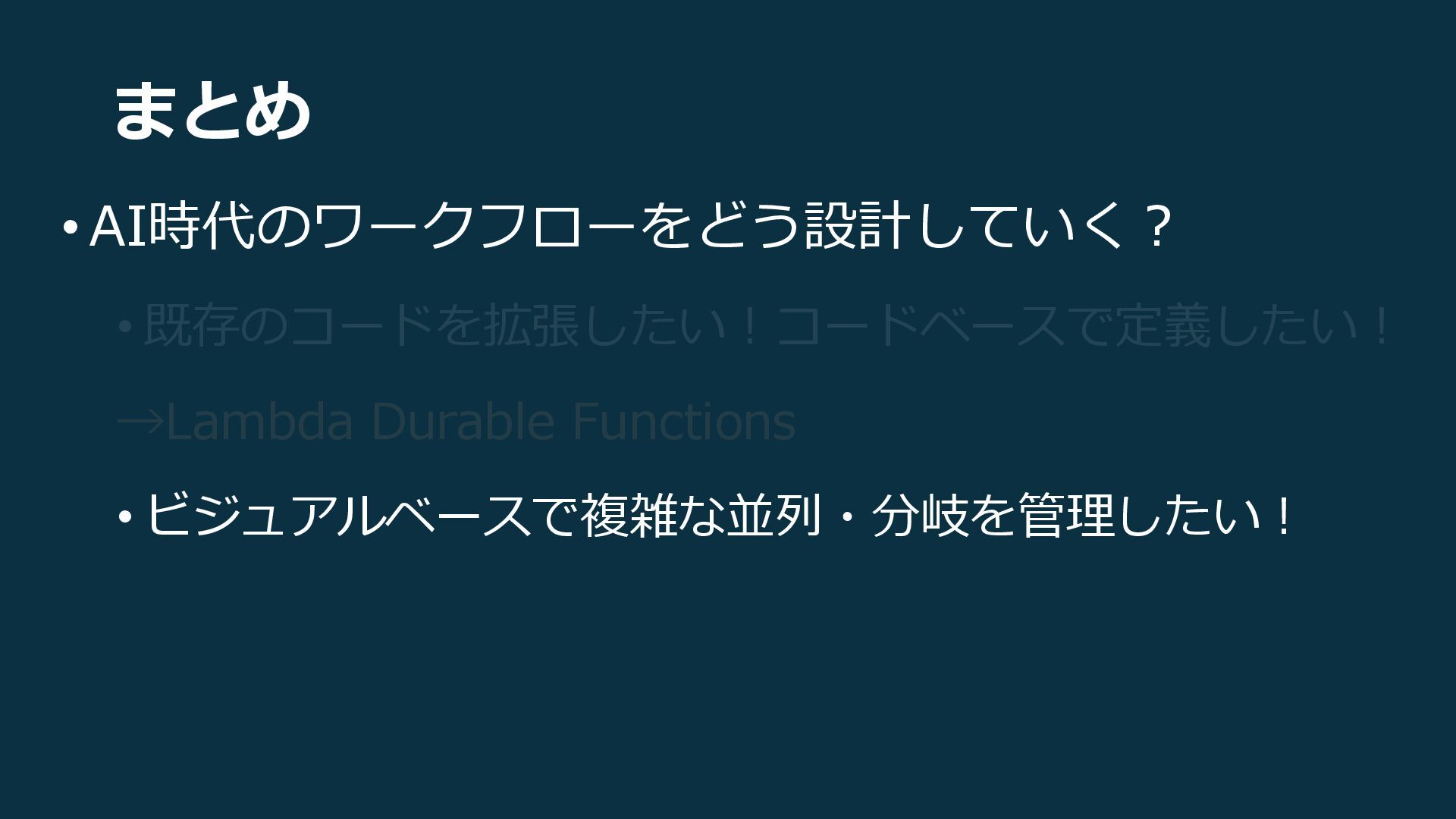 まとめ • AI時代のワークフローをどう設計していく? • 既存のコードを拡張したい!コードベースで定義したい! →Lambda Durable Functions • ビジュアルベースで複雑な並列・分岐を管理したい!