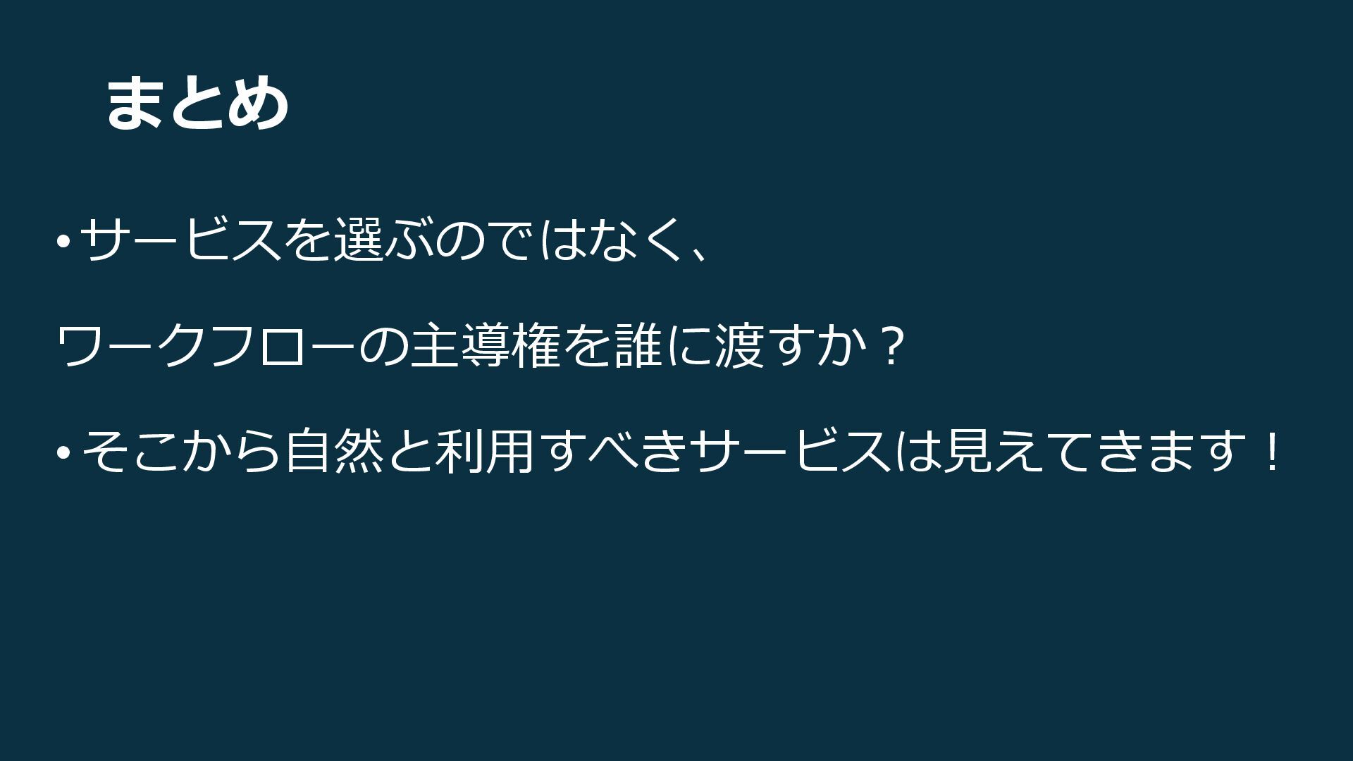 まとめ • サービスを選ぶのではなく、 ワークフローの主導権を誰に渡すか? • そこから自然と利用すべきサービスは見えてきます!