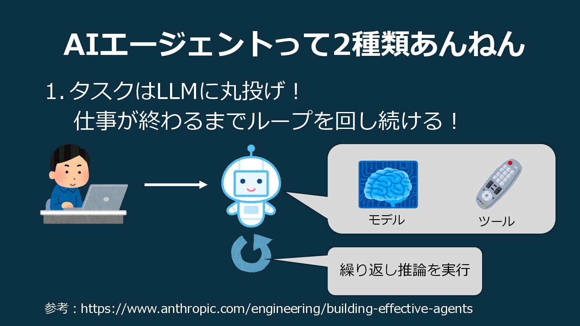 AIエージェントって2種類あんねん 1. タスクはLLMに丸投げ! 仕事が終わるまでループを回し続ける! 参考:https://www.anthropic.com/engineering/building-effective-agents 繰り返し推論を実行 モデル ツール