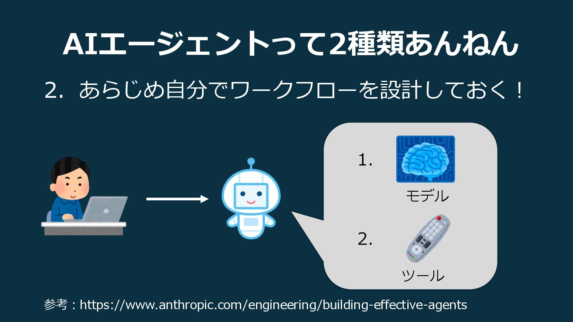 AIエージェントって2種類あんねん 2. あらじめ自分でワークフローを設計しておく! 参考:https://www.anthropic.com/engineering/building-effective-agents モデル ツール 1. 2.