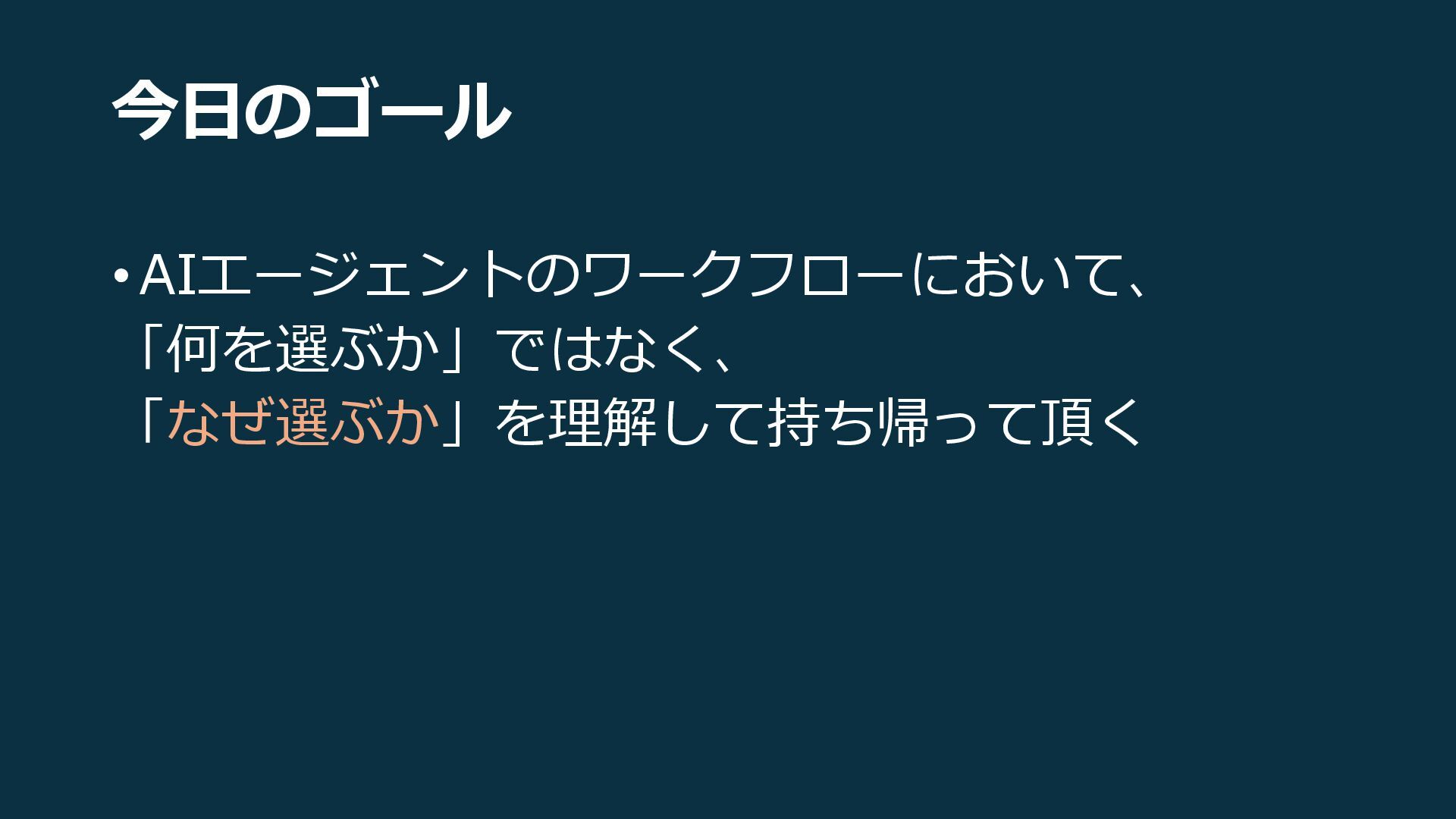 今日のゴール •AIエージェントのワークフローにおいて、 「何を選ぶか」ではなく、 「なぜ選ぶか」を理解して持ち帰って頂く