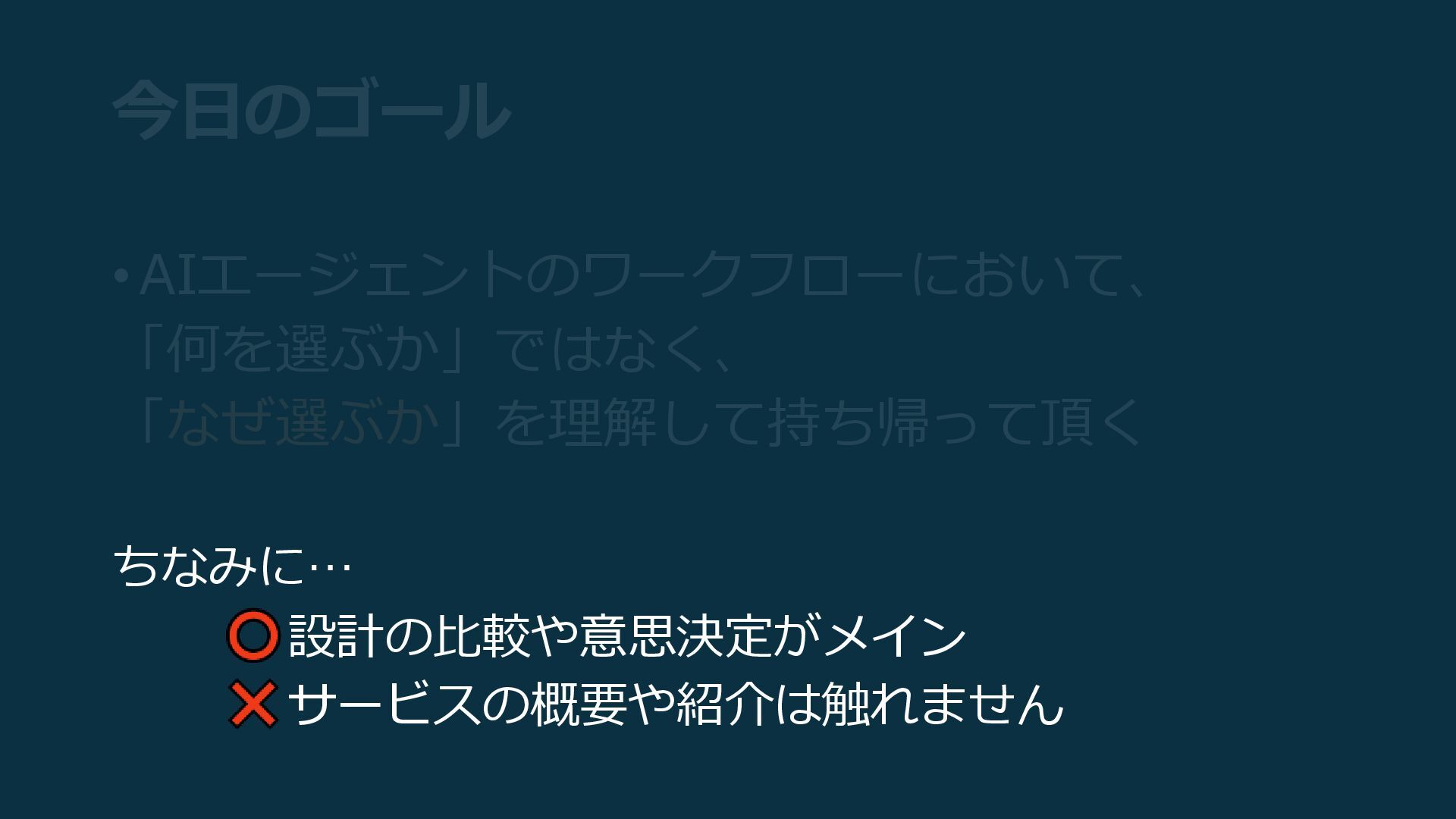 今日のゴール •AIエージェントのワークフローにおいて、 「何を選ぶか」ではなく、 「なぜ選ぶか」を理解して持ち帰って頂く ちなみに… 設計の比較や意思決定がメイン サービスの概要や紹介は触れません