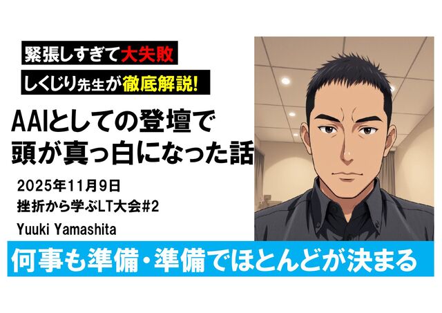 緊張しすぎて大失敗 しくじり先生が徹底解説! 何事も準備・準備でほとんどが決まる AAIとしての登壇で 頭が真っ白になった話 2025年11月9日 挫折から学ぶLT大会#2 Yuuki Yamashita