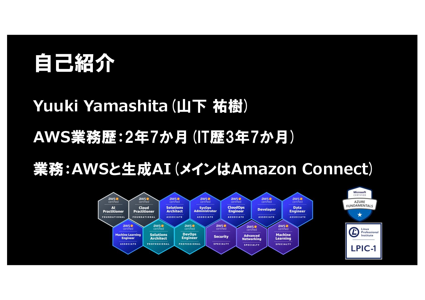 自己紹介 Yuuki Yamashita(山下 祐樹) AWS業務歴:2年7か月(IT歴3年7か月) 業務:AWSと生成AI(メインはAmazon Connect)