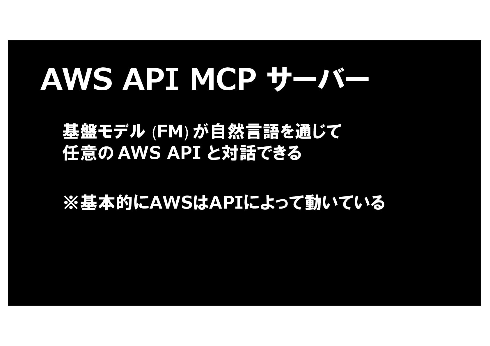 AWS API MCP サーバー 基盤モデル (FM) が自然言語を通じて 任意の AWS API