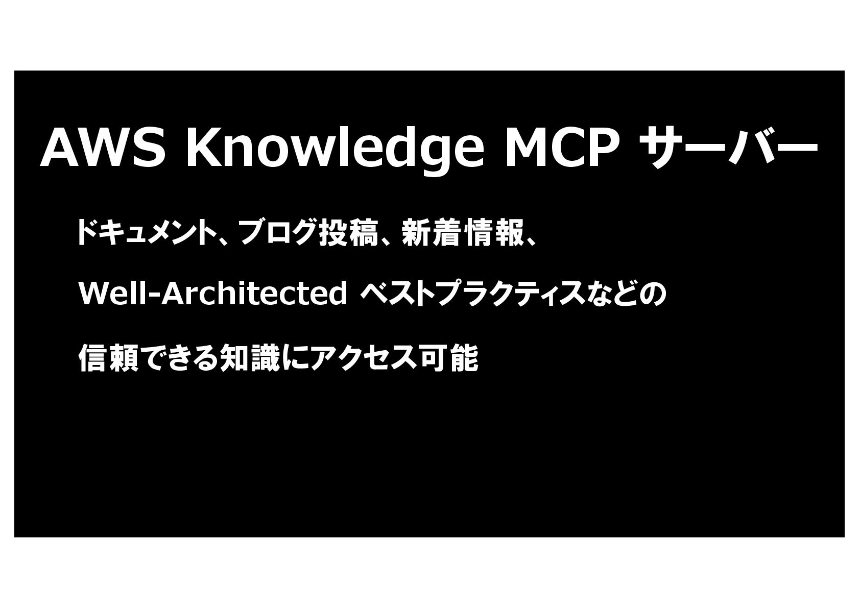 AWS Knowledge MCP サーバー ドキュメント、ブログ投稿、新着情報、 信頼できる知識にアクセス可能 Well-Architected ベストプラクティスなどの