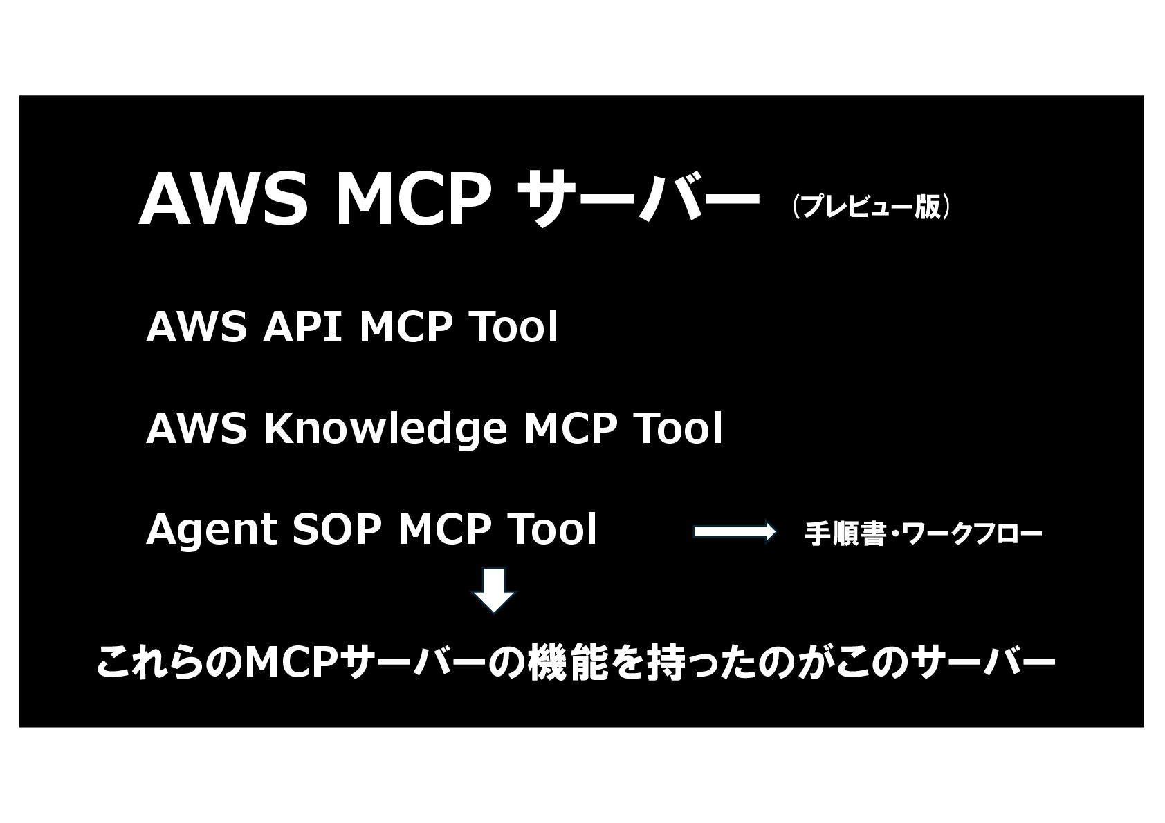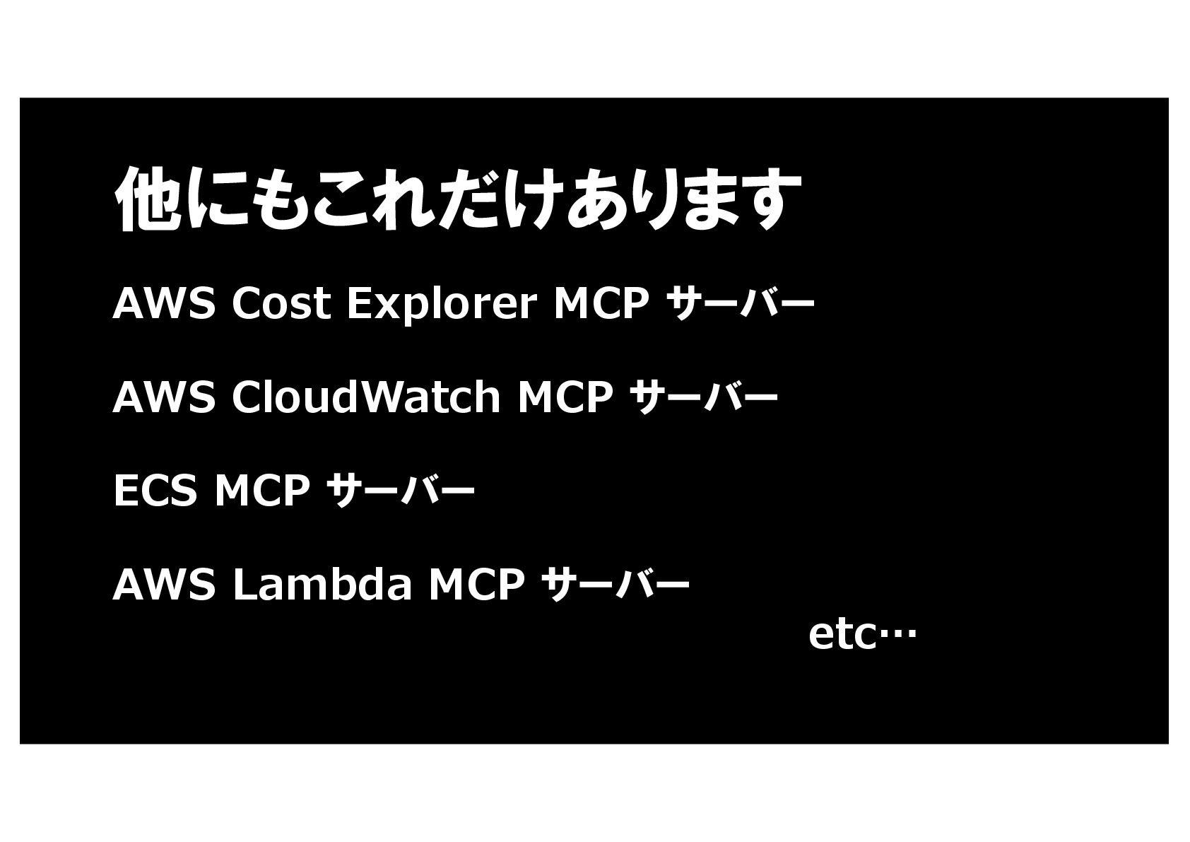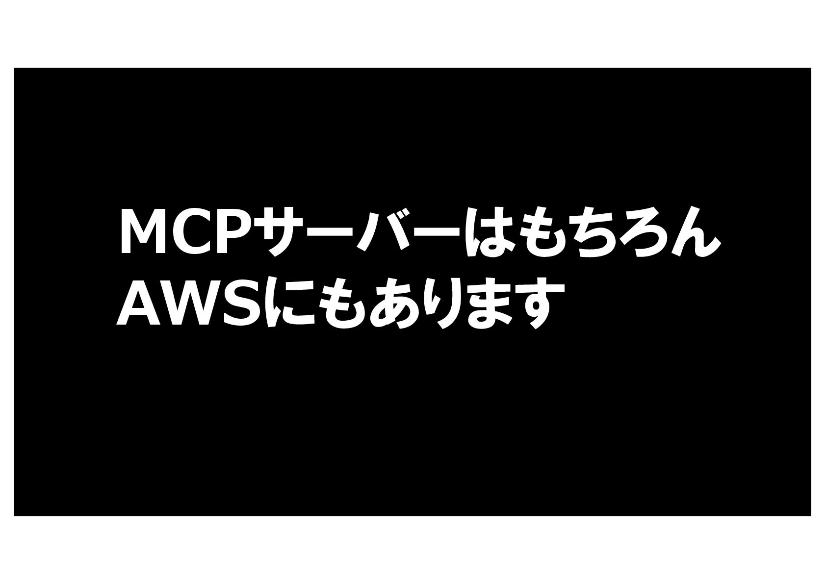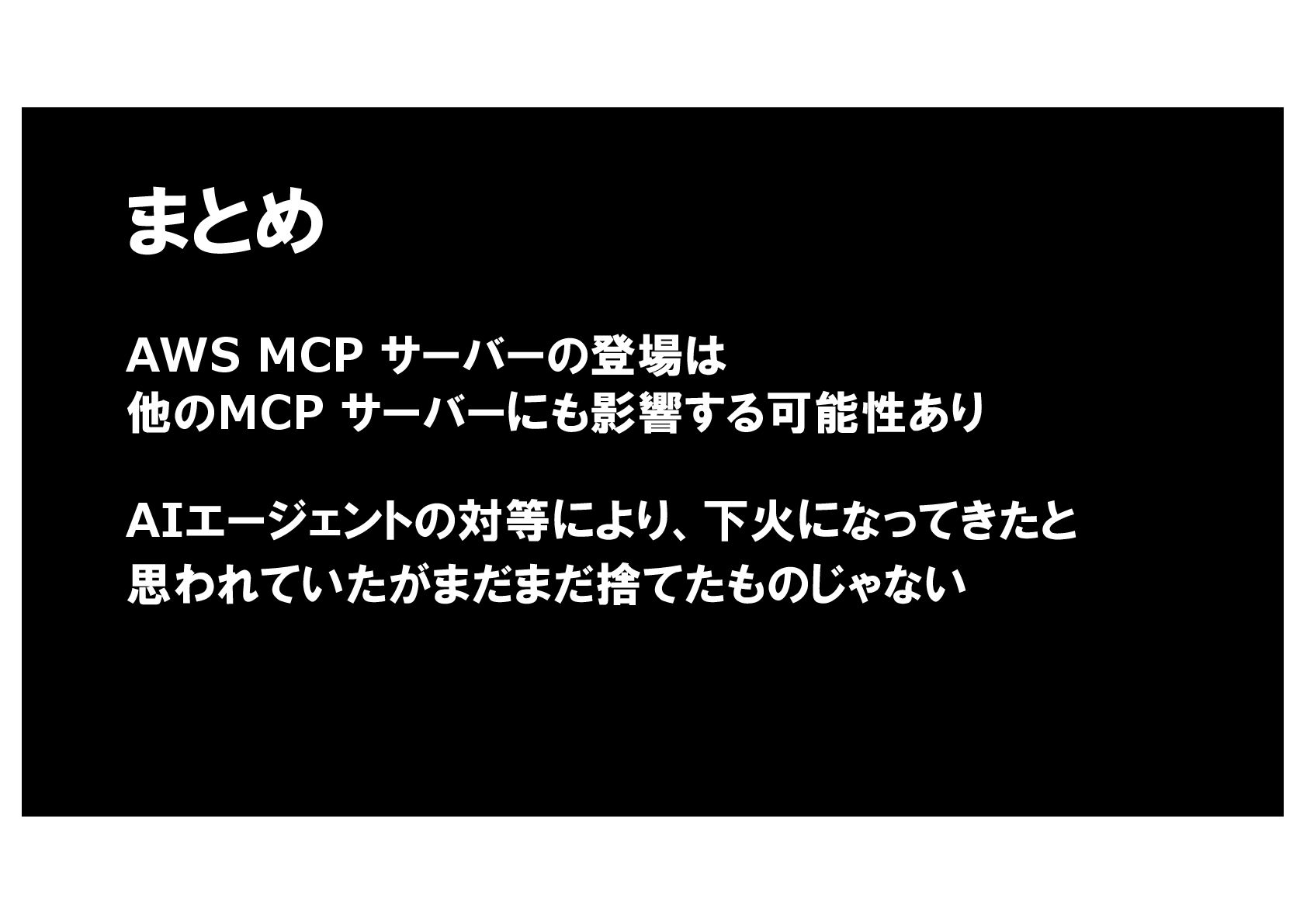 まとめ AWS MCP サーバーの登場は 他のMCP サーバーにも影響する可能性あり AIエージェントの対等により、下火になってきたと 思われていたがまだまだ捨てたものじゃない