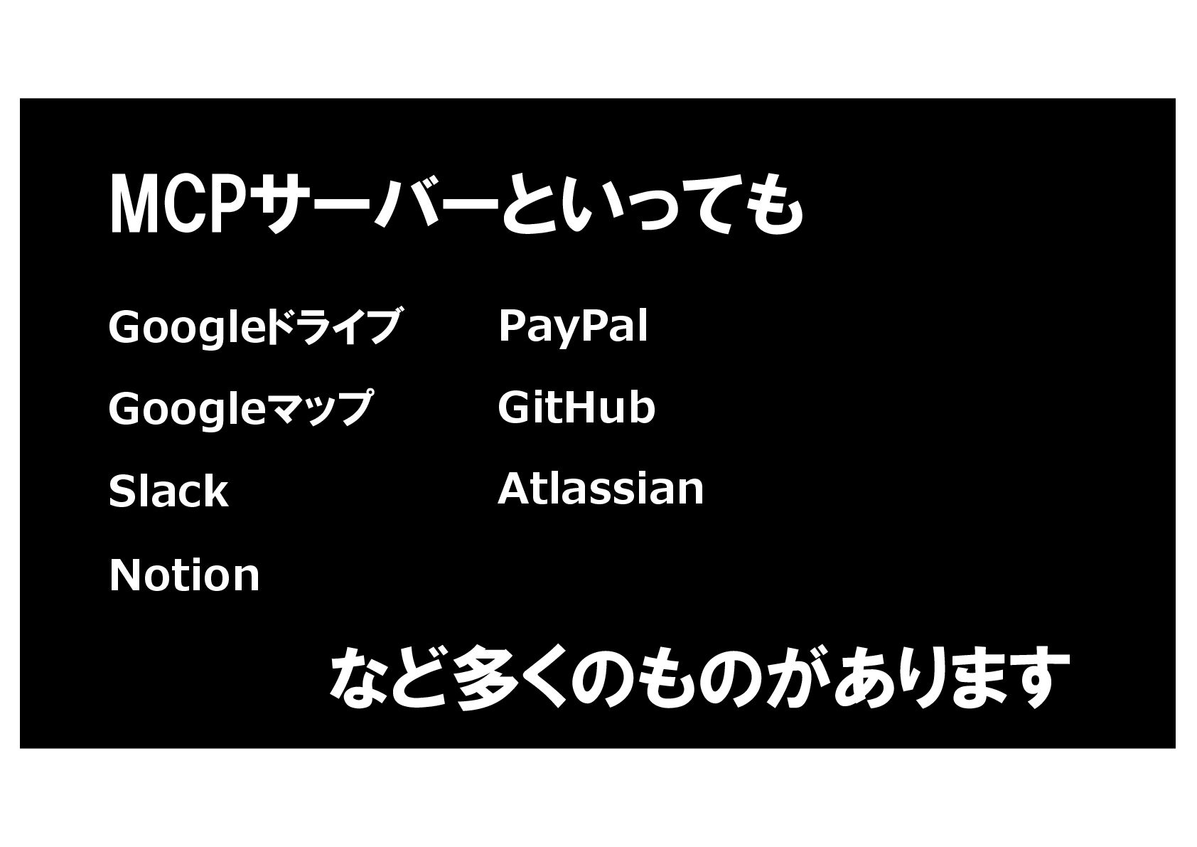 MCPサーバーといっても Googleドライブ Notion Slack Googleマップ PayPal GitHub Atlassian など多くのものがあります