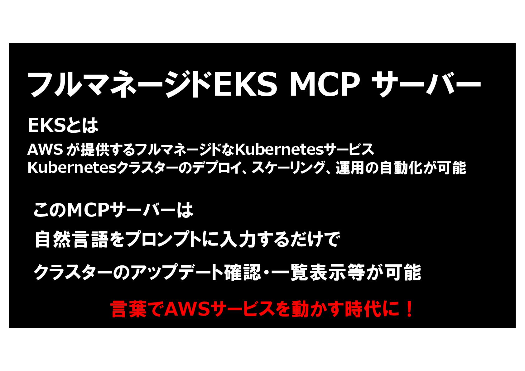 フルマネージドEKS MCP サーバー AWS が提供するフルマネージドなKubernetesサービス Kubernetesクラスターのデプロイ、スケーリング、運用の自動化が可能 EKSとは このMCPサーバーは 自然言語をプロンプトに入力するだけで クラスターのアップデート確認・一覧表示等が可能