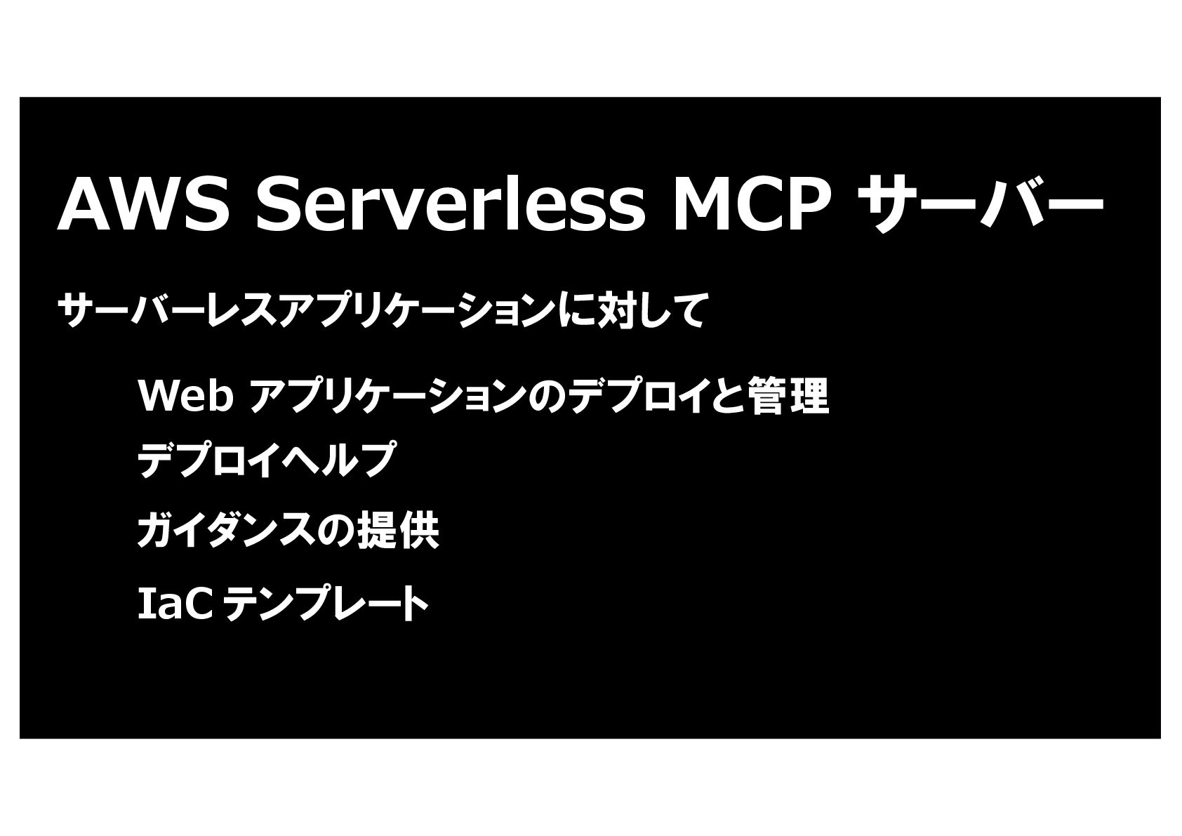 AWS Serverless MCP サーバー サーバーレスアプリケーションに対して Web アプリケーションのデプロイと管理 デプロイヘルプ ガイダンスの提供 IaC